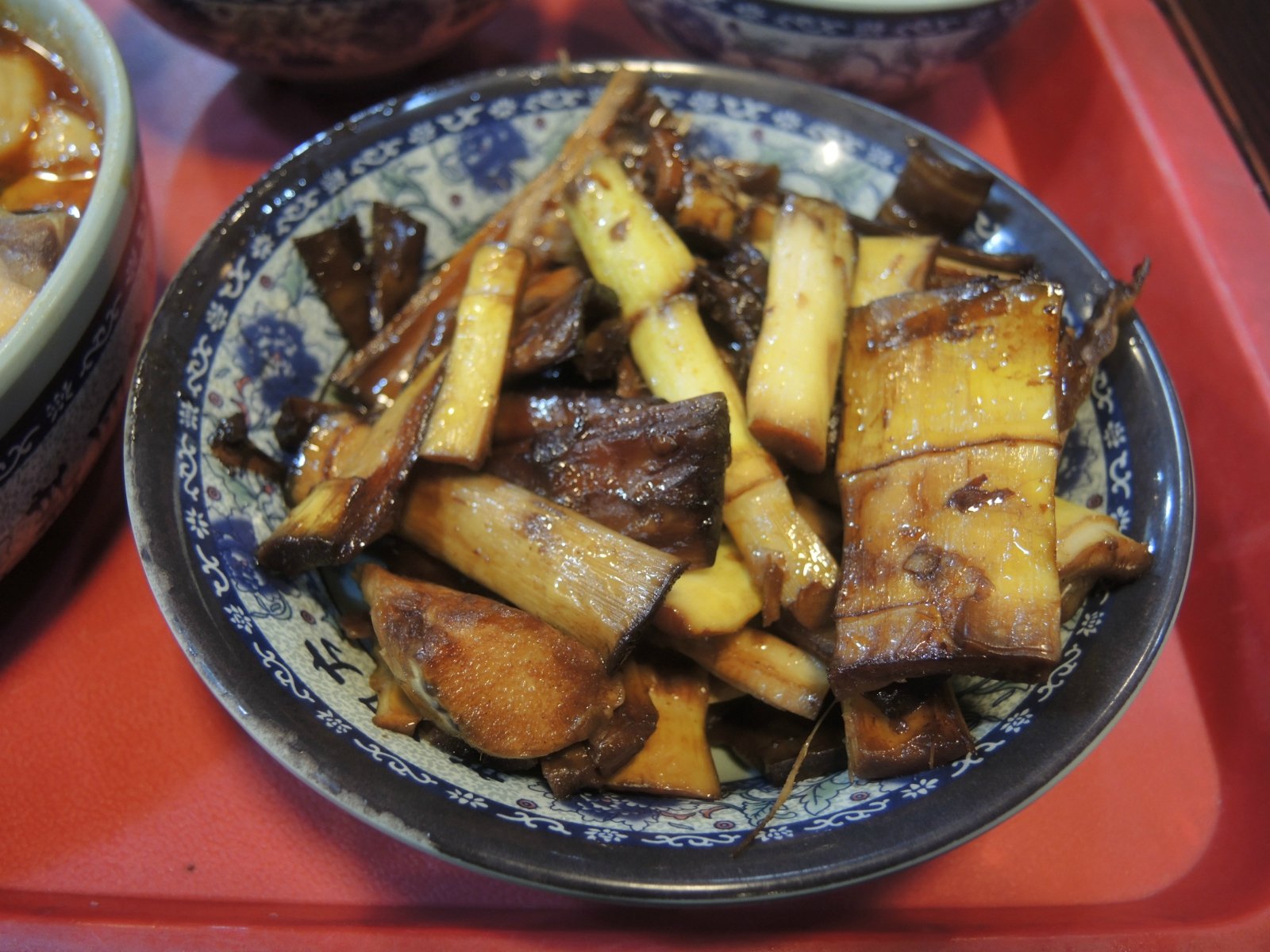 春笋烧笋干,10元。来了浙江,最不能错过的食物就是竹笋,尤其是在春天。这道烧笋用的是否春笋,我们分不清楚,但是竹笋的清香鲜嫩还是很地道的,味道真的是十足十足的。竹笋是素菜中的雅士,既然素雅,就必须要有比较多一些的油脂来烹制,所以就有了油焖笋、油浸笋、猪肉烧笋等一道道名菜。这道烧笋也是如此,碗中的一条条笋段儿都是油光锃亮的,无论是否出菜时的明油“化妆”,至少视觉上很舒服。夹一条入口,脆嫩清香,一点也不柴素,让人联想到古人的佳句:宁可食无肉,不可居无竹。但我们用扣肉与烧笋相伴,岂不是一举两得?