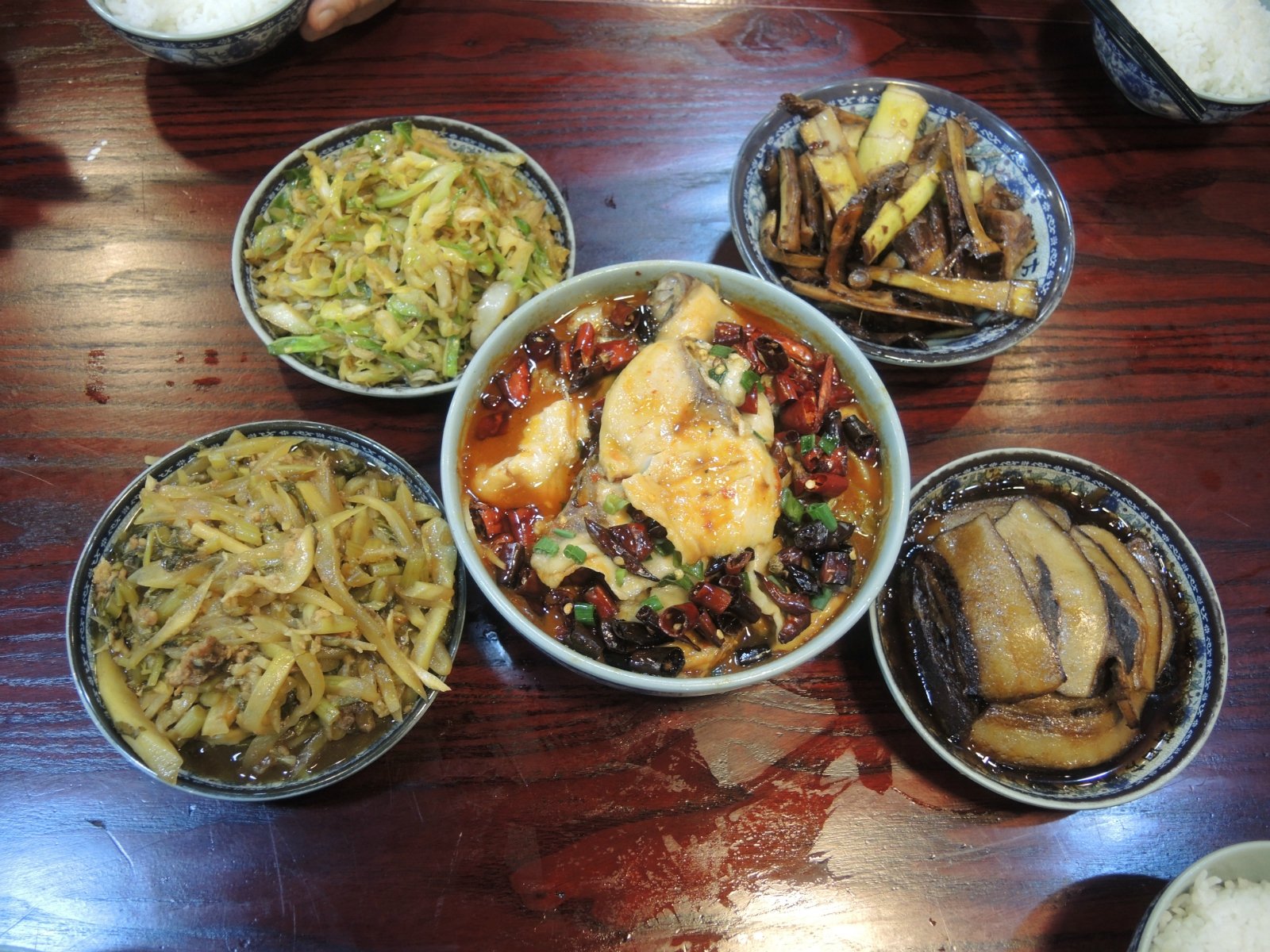 我们的晚餐,五道菜:酸菜鱼、霉干菜扣肉、肉末笋丝咸菜头、春笋烧笋干、虾米包心菜。