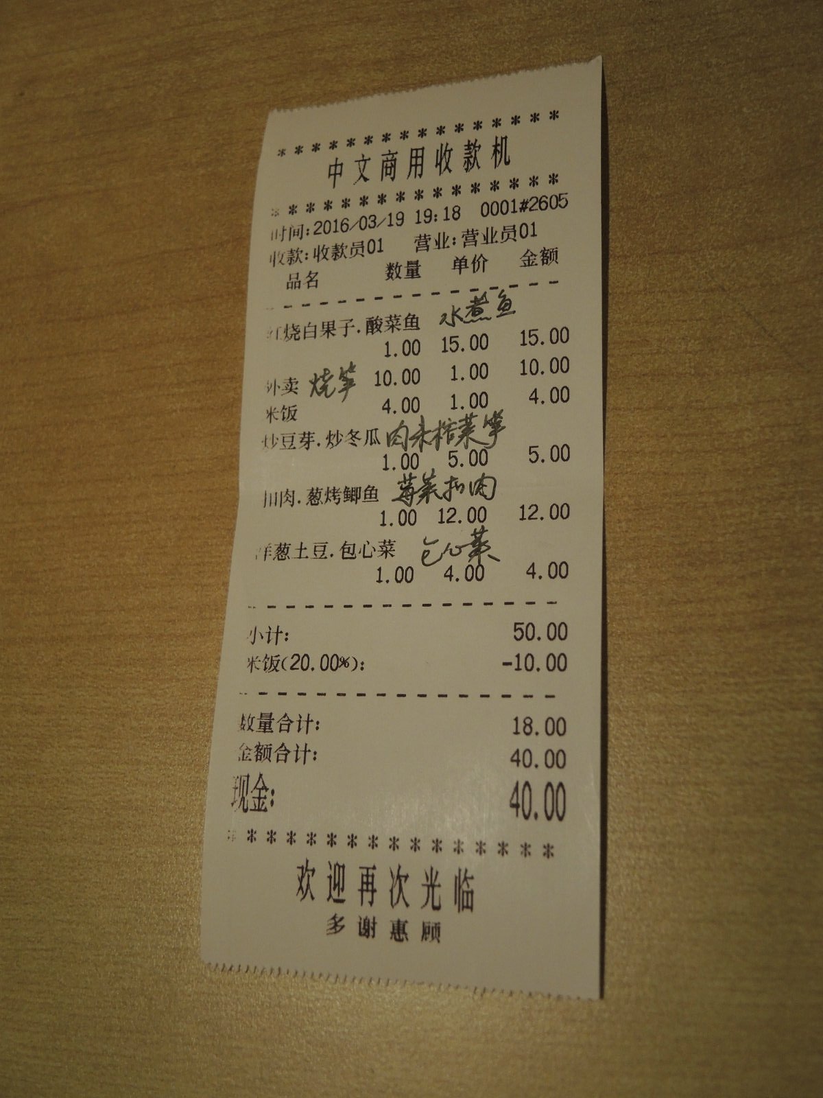 我们的晚餐,荤素搭配,味道不错,一共才50元。更令我们惊喜的是,大食堂晚上18:30以后来用餐还有8折的优惠,实收40元,便宜得我们都有些不敢相信了!