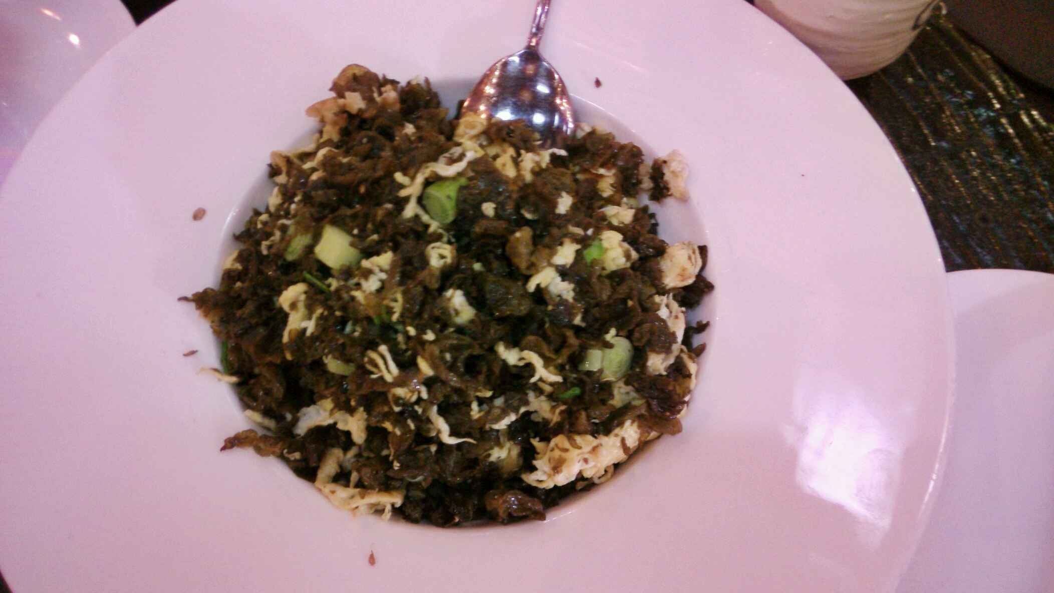 地皮菌炒鸡蛋,典型的湖南乡土菜,期望高高的,吃起来感觉很一般,地皮菌有点发柴,也没搁红辣椒口味比在其他湘菜馆吃的稍有逊色,也许是今天人比较多,厨师忙不过来吧,这个菜欠点功夫。