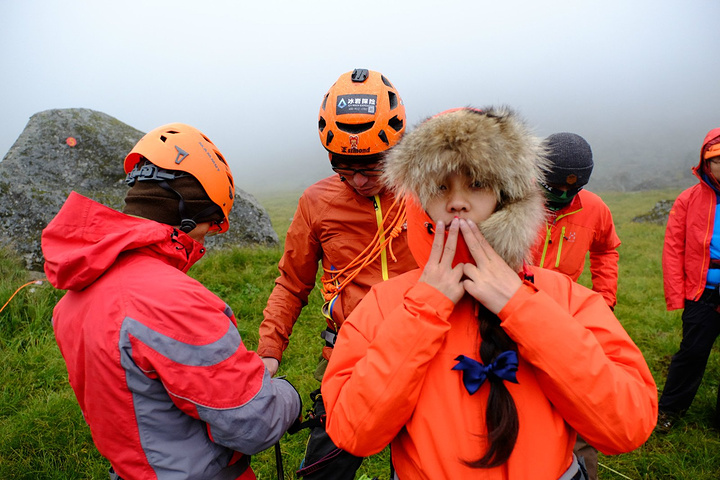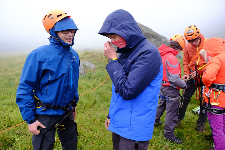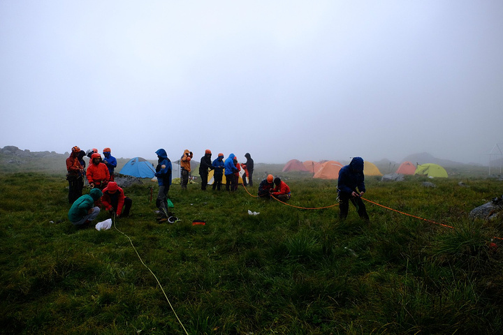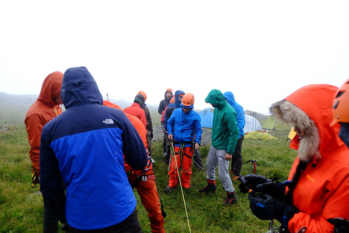 分别开始扎营,本来想立马缩进帐篷做吃的,好饿啊。。。可是不行,刚扎好营就要出来学习技术装备的使用方法,大部分人都是第一次尝试技术山峰,装备都还不会用。