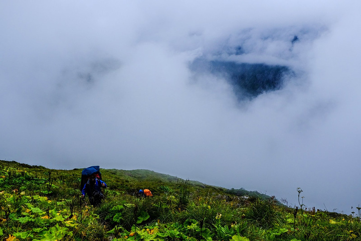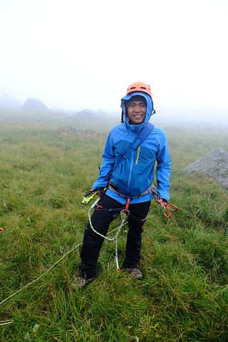 身上挂一大堆东西,营地始终被大雾所笼罩,还断断续续的下着雨。