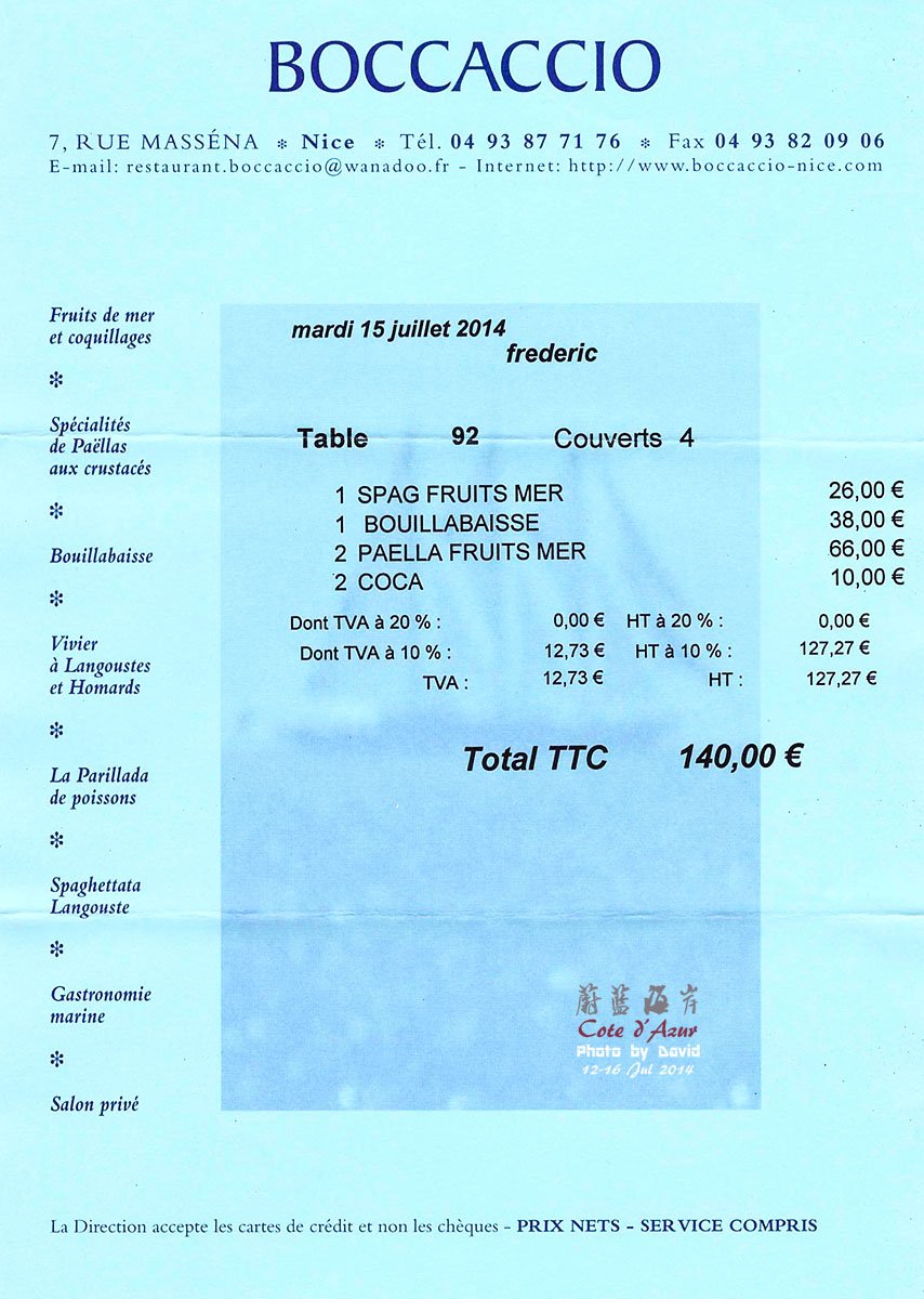 海鲜意面26欧,马赛鱼汤38欧,双人的海鲜饭PAELLA66欧,两瓶可乐10欧,晚餐的总价140欧,总体还是物有所值的。别心疼5欧元一瓶的可乐啊,起码在法国就餐,还是可以索要免费的TABLE WATER的,也就是可饮用的冰水可以免费提供,到了西班牙、意大利,餐桌上所有的饮品都需要点单购买,冰水也不例外……