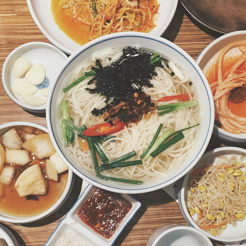 点了一份素面,嗯...就真的是很清水的面www 最上面的凉拌葱丝拌生鸡蛋 用生菜包着和猪肉一起吃.