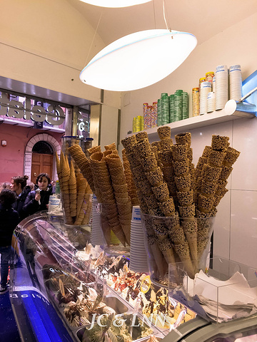 现在我要说两个小秘密:1.我不喜欢吃冰激凌!2.意大利的冰激凌真的好好吃哦! 没有刻意去找lonely planet推荐的冰激凌店,走着走着看见一家,玲琅满目,一眼望不到头的冰柜啊,我想说榛子味的好好吃,浓浓的香甜感,甩哈根达斯之类好几条街。