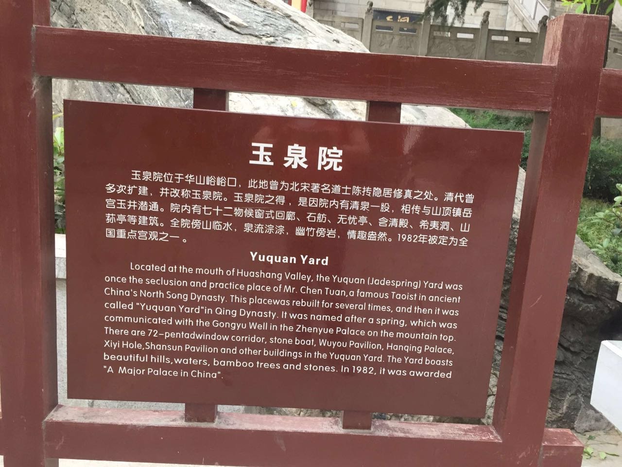 都说凭借华山的门票(48小时内)可以免费游览玉泉院,免费乘坐摆渡车,后来发现人家根本不验票。玉泉院在玉泉路的尽头,整条路上密密麻麻都是卖登山用品的超市、小饭店、客栈。登山用品价格比远处那条街贵上1-2块,饭店的饭菜很一般,住宿比较脏,不推荐在玉泉院在这里吃住。玉泉院外的广场上有许多寄存包裹的地方,价格比着泰山火车站的寄存贵了些。