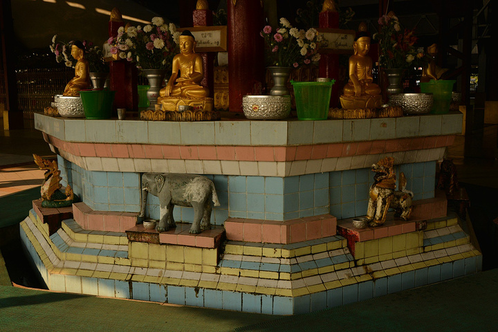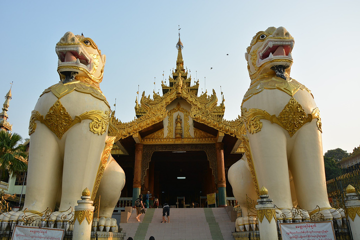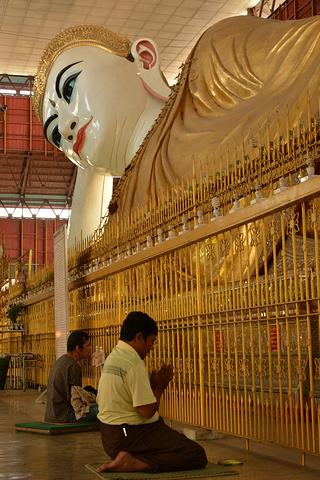 乔达基卧佛寺(Chaukhtatgyi Paya)和Ngahtatgyi Paya隔路相望,两个寺庙本想匆匆一瞥,却又驻足观看许久,两个不同风格的寺庙,建筑砖瓦结构和木质结构,卧佛与坐佛。让人震撼的是乔达基65米长的卧佛,巨大的脚上贴满了各种不同形象的贴片。卧佛旁的一个圆台有八尊佛像,对应下面八种动物,缅甸属相分八个(虎、狮、象、无牙象、鼠、天竺鼠、龙、妙翅鸟),按一周七天算,其中周三早上和下午分别为象和无牙象两个属相,和中国的十二生肖有异曲同工之妙。而狮与虎作为守护神位居属相之前二,和中国传统文化相仿的是,门前两只石狮也是作为门神那般存在,在缅甸多处亦可见到。