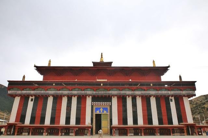 走近查杰玛大殿,第一眼就被其独特的造型所吸引。外观呈正方形状,红白黑三色相间的殿宇高耸挺立直逼云霄,似要扛起整个天空。显的那么沉稳庄重,还带些神秘的色彩。在大殿的底层绕寺一周设有无数个转经筒,信奉者的转经朝圣。
