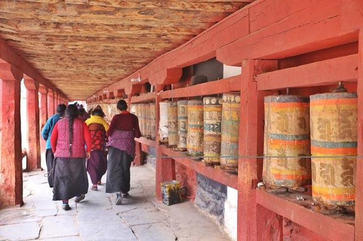 在大殿的底层绕寺一周设有无数个转经筒,信奉者的转经朝圣。走近查杰玛大殿,第一眼就被其独特的造型所吸引
