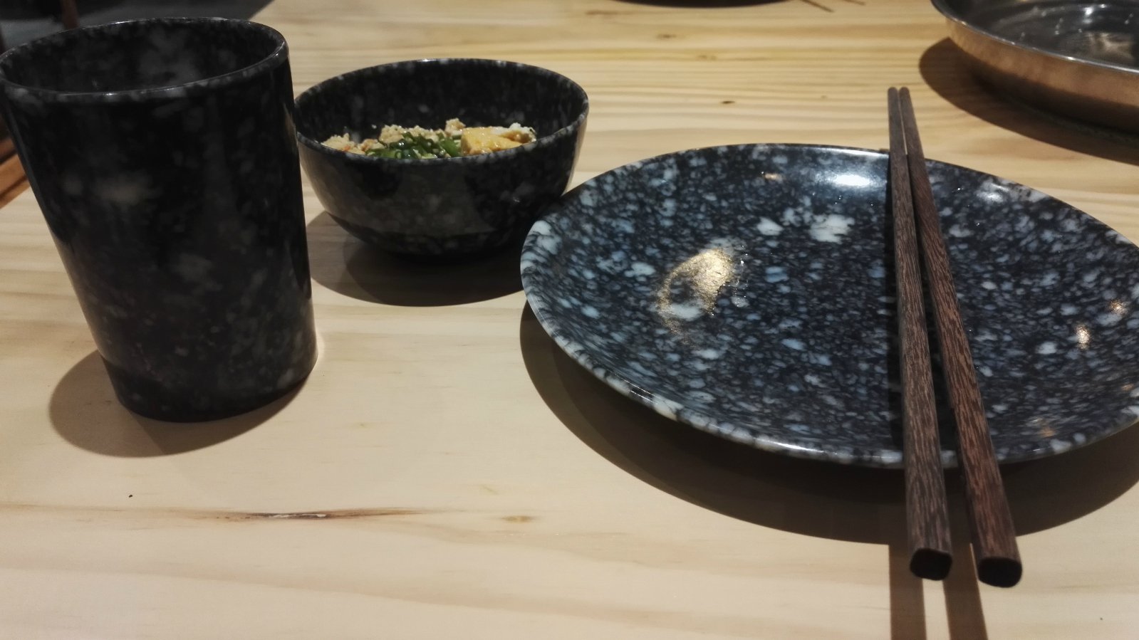 在杭州出差时天气比较冷,于是就是住的附近一家老北京火锅店,名称叫做“南虾北羊”。