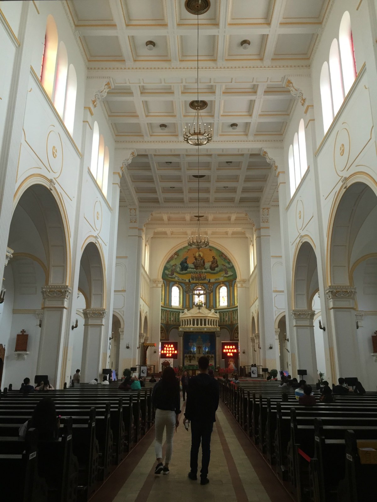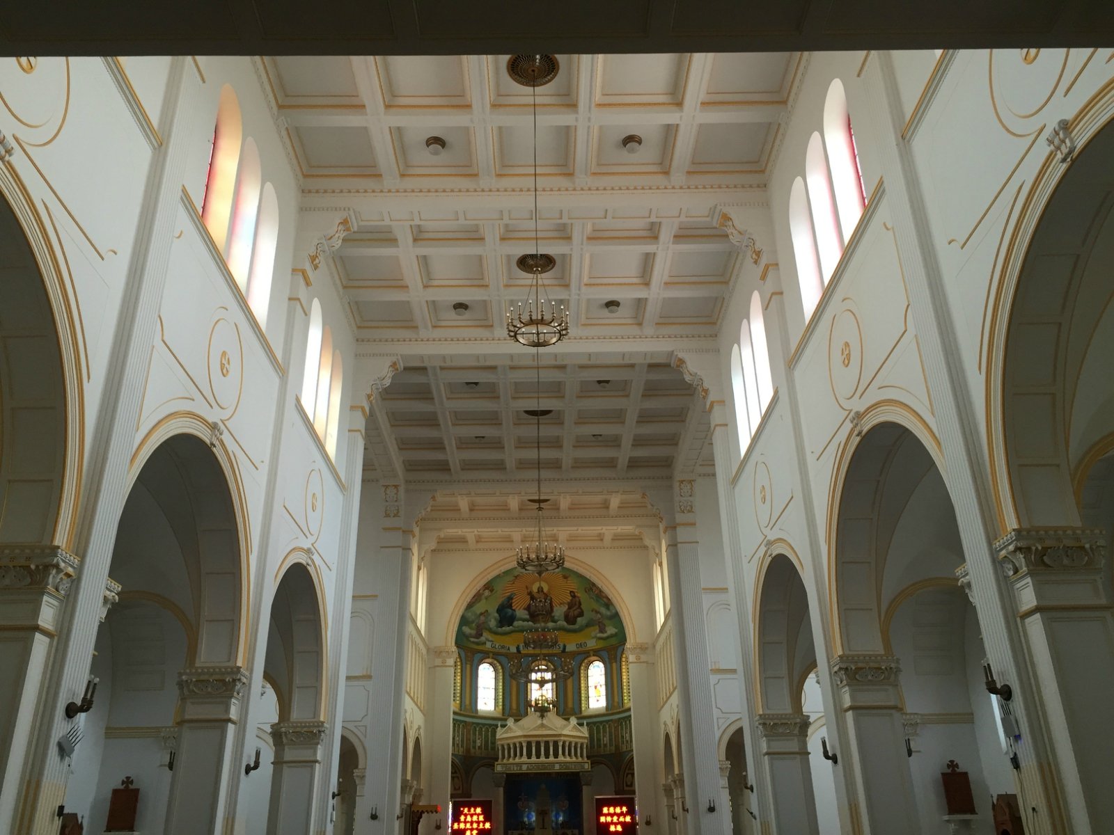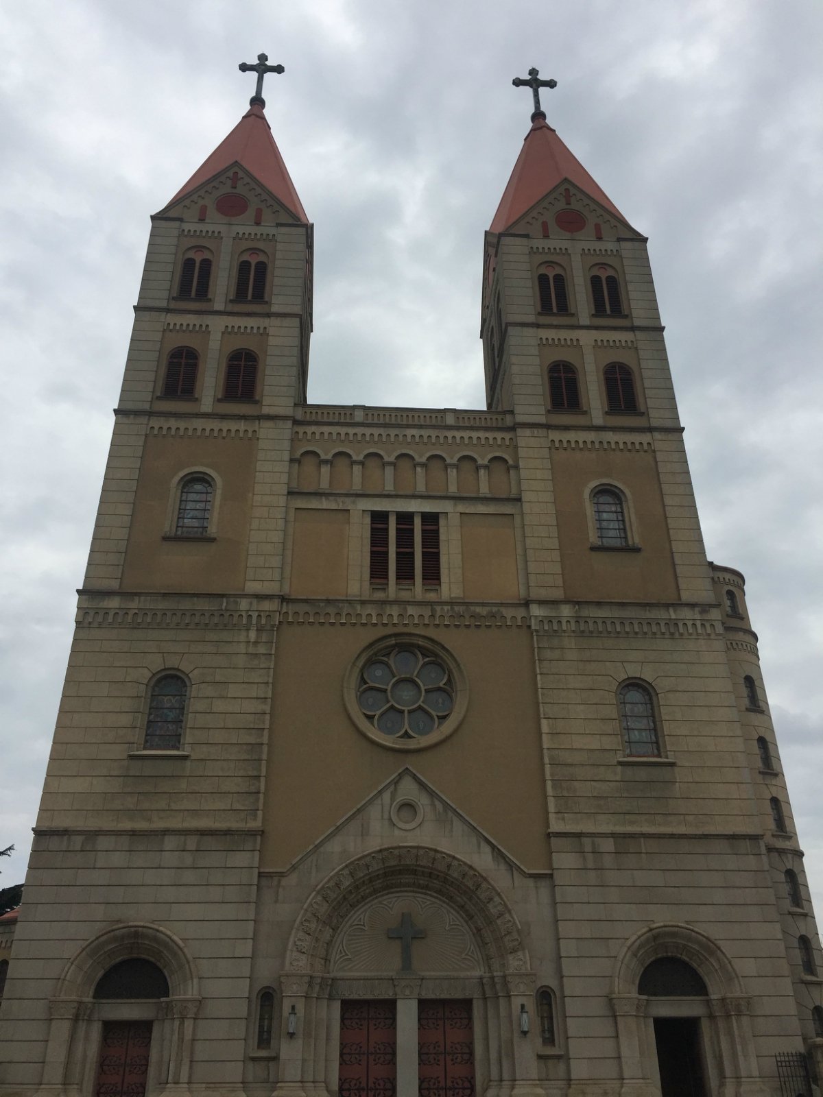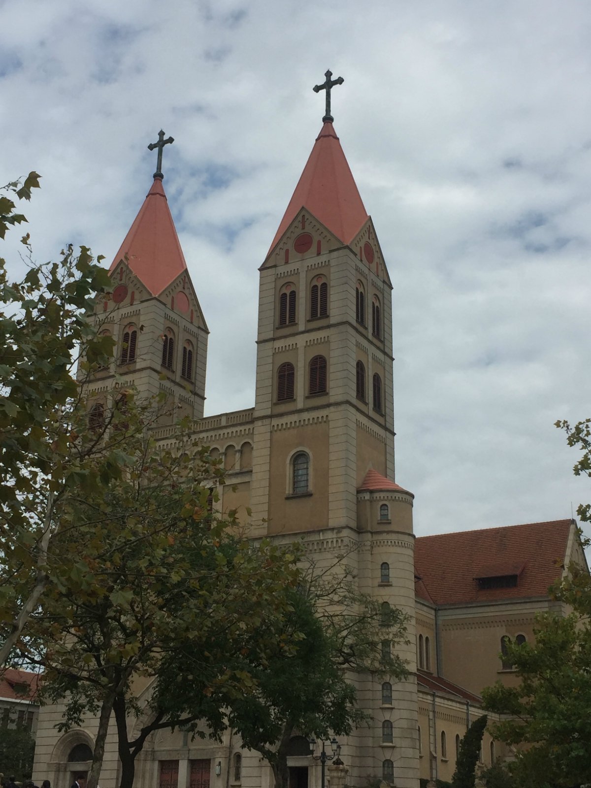 它是青岛的第一座教堂,建于1932年,平面呈现拉丁十字型,是个占地面积约2470平方米,总长度为65米的“大家伙”。整个建筑是钢筋混凝土与花岗岩结构,才能在这么长的岁月里面完好地保存下来,正门面南,在其左右设有衬门。正门上方有一巨大的玫瑰窗,两侧各耸立1座塔身高56米的钟塔,塔顶各竖有4米高的巨大十字架,塔内上部悬大钟4个。耳堂长34米,教堂大厅檐高18米。左右设有走廊,配有很有特色彩色玻璃窗,窗上还有主耶稣等人物的图案,衬托上方穹顶的圣像壁画,整个感觉非常庄严肃穆。教堂后方分别设大小祭台和可容纳千余人的席位,前门上方有唱经楼1个,有管风琴1架(听说这个风琴是古老的文物,现在已经坏了,二楼是不能上去参观的,里面有不少历史文物)。