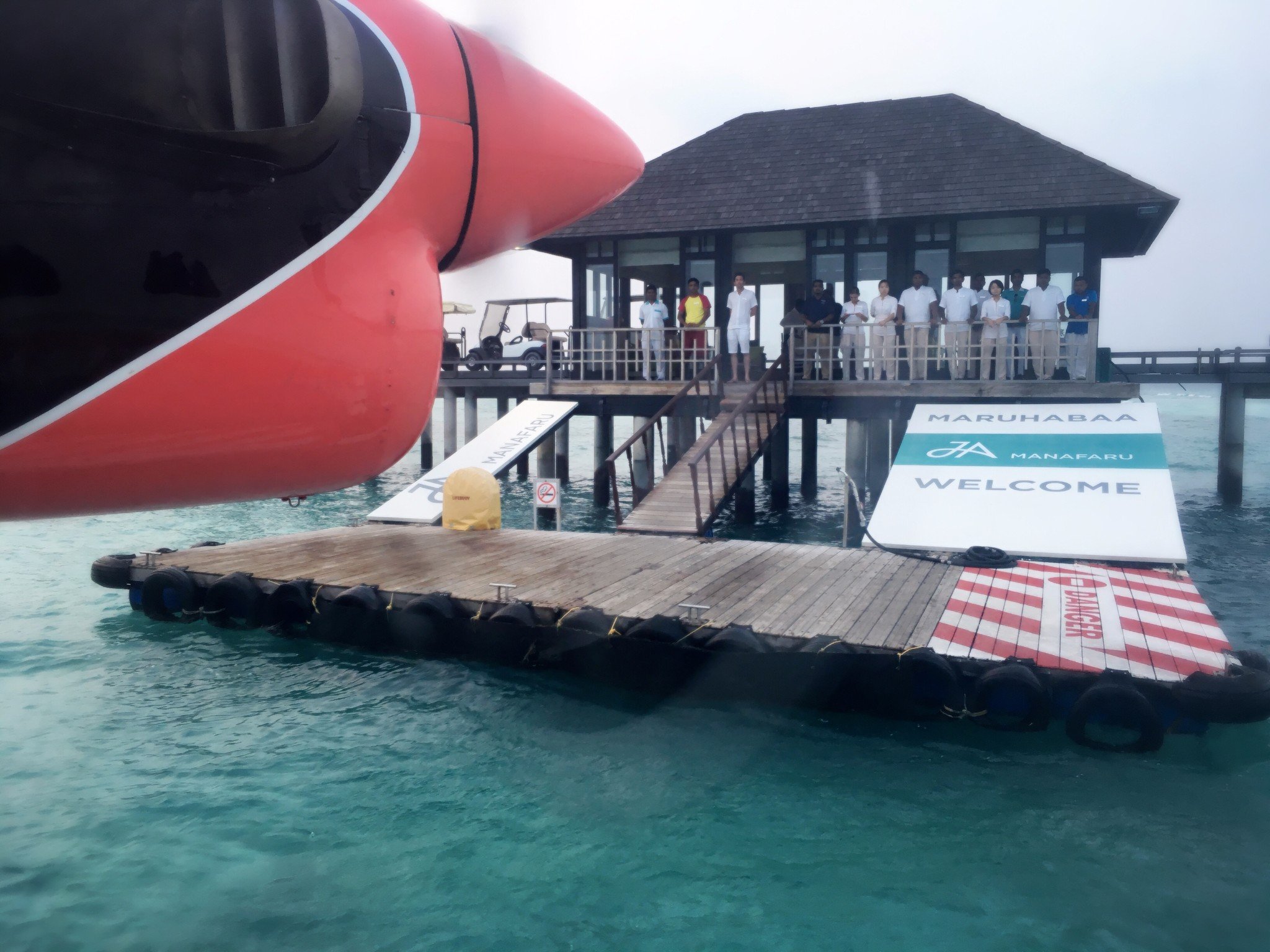岛上的员工都站在码头上等着我们,下飞机后,他们拍着手鼓,给每个人递上毛巾和一杯好好喝的果汁!算是一个欢迎仪式吧~还是很贴心的