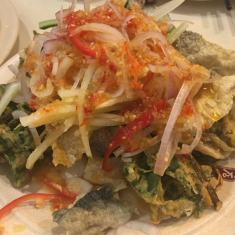 4个小时的飞行,晚餐吃的是“店小二”。在Jurong Point的一层,因为离得最近,点了十全烤鸭、蒙古排骨、虾酱炒空心菜、还有一道外面裹蛋黄的炸食。烤鸭不同于之前在广东吃过的烧鸭,有一点点药材的味道,酱汁带点甜。蒙古排骨兼辣和酸,也是甜(苦笑)比较很下饭。还有马来口味的炒空心菜,咸了一点,喜欢的人可以尝尝。挺新加坡口味的,正常的家常菜。