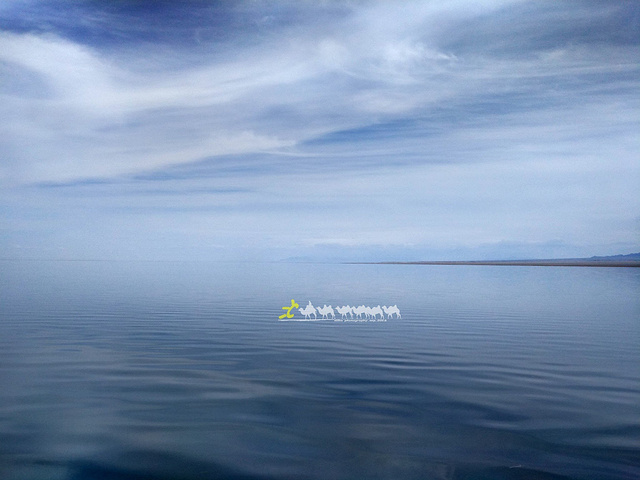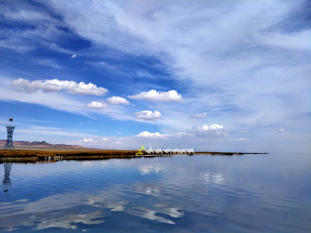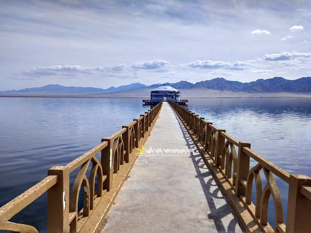 吃饱继续赶路的节奏,小白司傅问我要不要去苏干湖,很小的湖,门票五块每个人,但不知会不会像昨天可鲁克湖一样,蚊子满天飞......我考虑了一下,既然来了,就去看一眼呗,也就五块钱,总得拍个照 到此一游。也就是几分钟的事情。于是惊喜从这一刻开始!! 这是一个可以算得上是要荒废的景点,两岸的芦苇草特别茂盛!也是一个生态湿地公园,我们就沿着眼前的跟进去,连一个门卫都没看到,跨过拦路的线索,一直飞奔进去,想用最短的时间拍完照 赶下一站。于是轻装上阵,只带了手机,单反没带进去。进去才发现,我的想法是错的,水天一色的风景让大家拍照 拍个不停,强烈阳光折射之下,如身处仙境一样。我路过草丛,惊起一群飞鸟,没能及时手机拍下。有一条小桥延伸到湖面中间,但是桥面已经开始倾侧,也有禁止进入的提示,小伙们都没注意太多,跑到桥的尽头,尽情享用美景拍照,重点这里没游客,除了我们几个。想怎样拍就怎样拍,照片效果大大超出我们的预期!