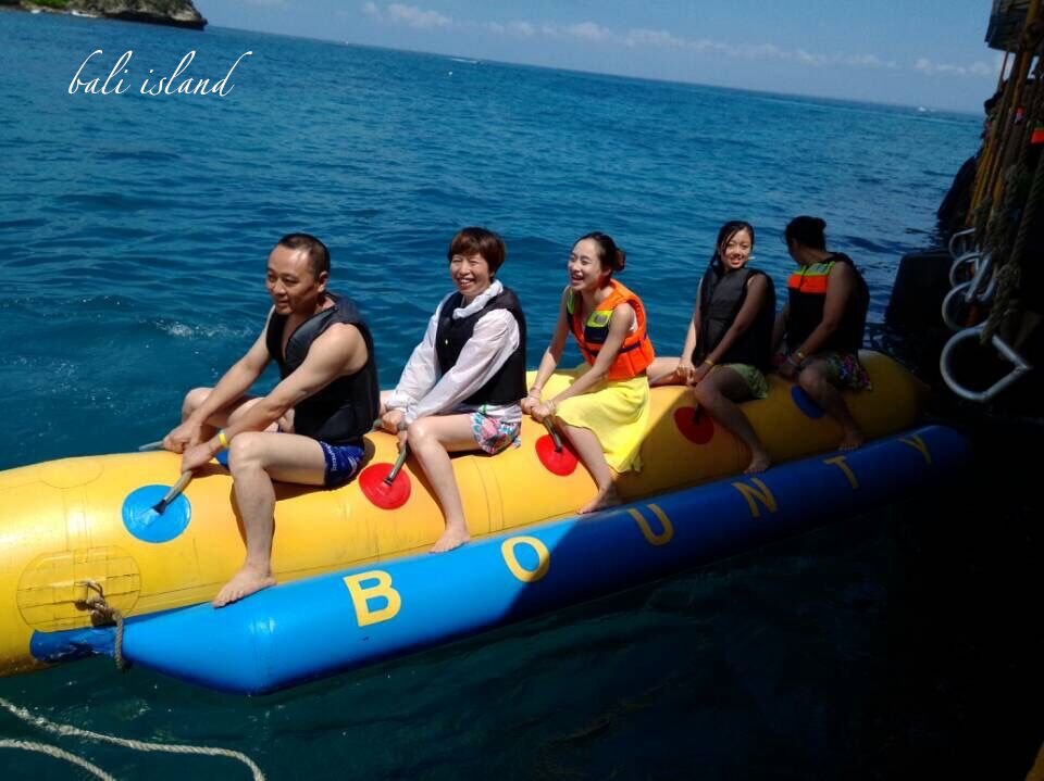 这是香蕉船,我妈坐了6次,当她准备坐第七次时,已经轮到她了,可是我们去岸边的船来了,她没有坐成,结果那一趟就翻船了,翻船了!救生员下去救的,有两个女生被吓哭了。