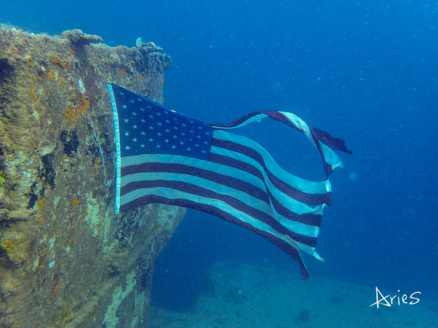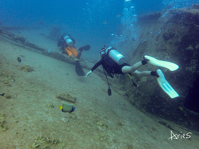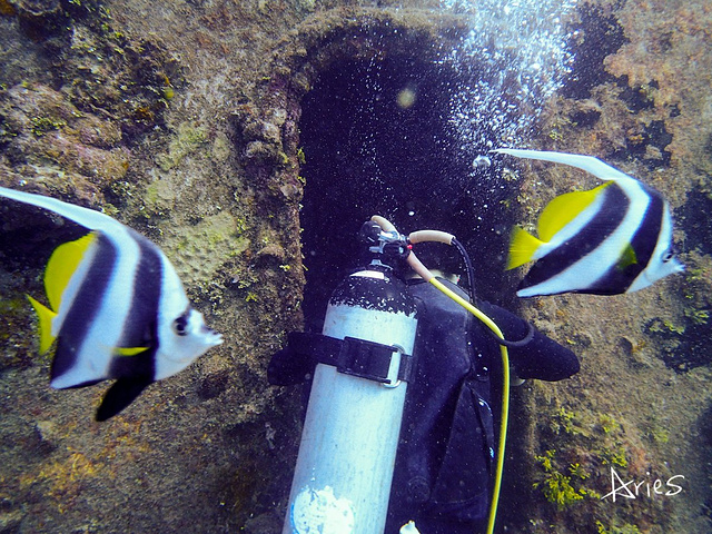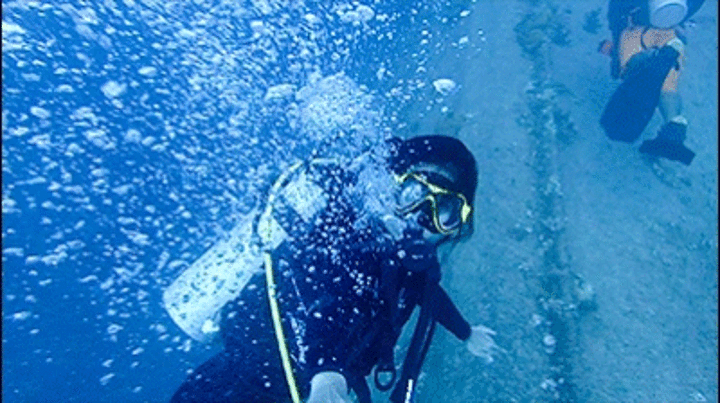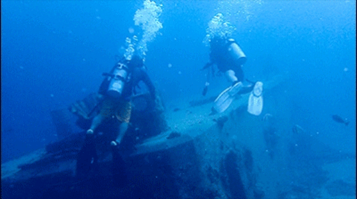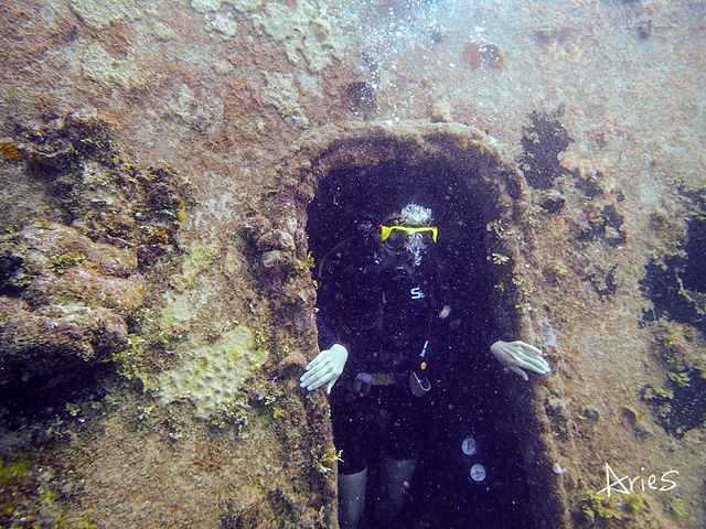模糊的船体随着我们的下降逐渐清晰,我睁大双眼,看着那些被海水锈蚀的痕迹,寂静中耳边仿佛传来炮火的轰隆声,幽幽的蓝绿里透出一丝恐怖的气氛
