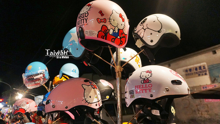 台湾,机车的王国。机车也就是我们说的摩托车,是台湾人日常出行的交通工具。安全帽是必备的哦,没有带安全帽,会被罚款2000台币。 夜市竟然有卖这么可爱的安全帽,我想这一定是我们国内夜市没有卖的东西。像一颗五彩树一样,这种卡通图案的安全帽。喜欢的不得了。