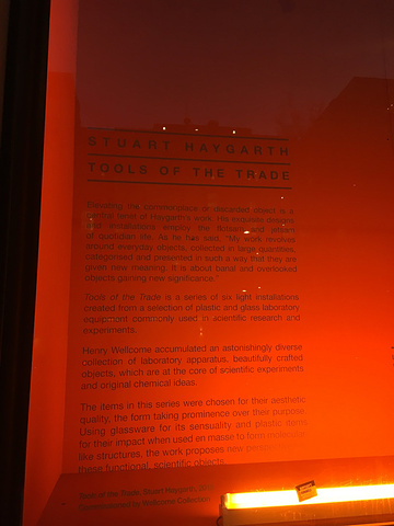 wellcome博物馆 是一个还算有趣的博物馆, 博物馆外面的展柜里有如下的展示,由英国设计师Stuart Haygarth设计,他是一个非常善于观察的设计师,他总能将日常生活中一些小物件发挥想象,变成一件令人惊艳称奇的作品,无论是纯净水瓶製成的树挂装饰灯亦或者是载有3000镜头的直径1.5米的巨型吊灯等。