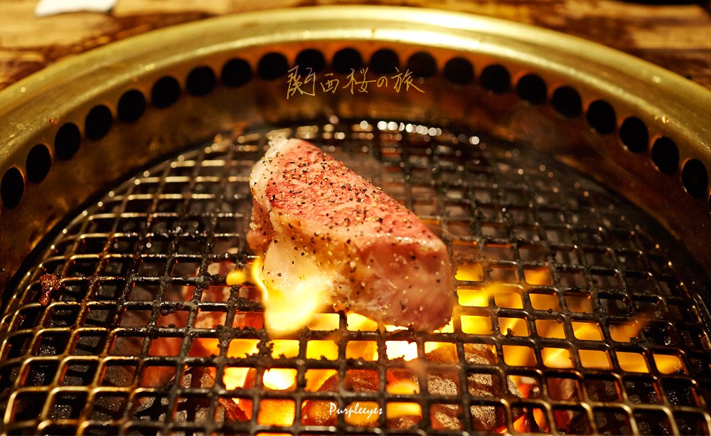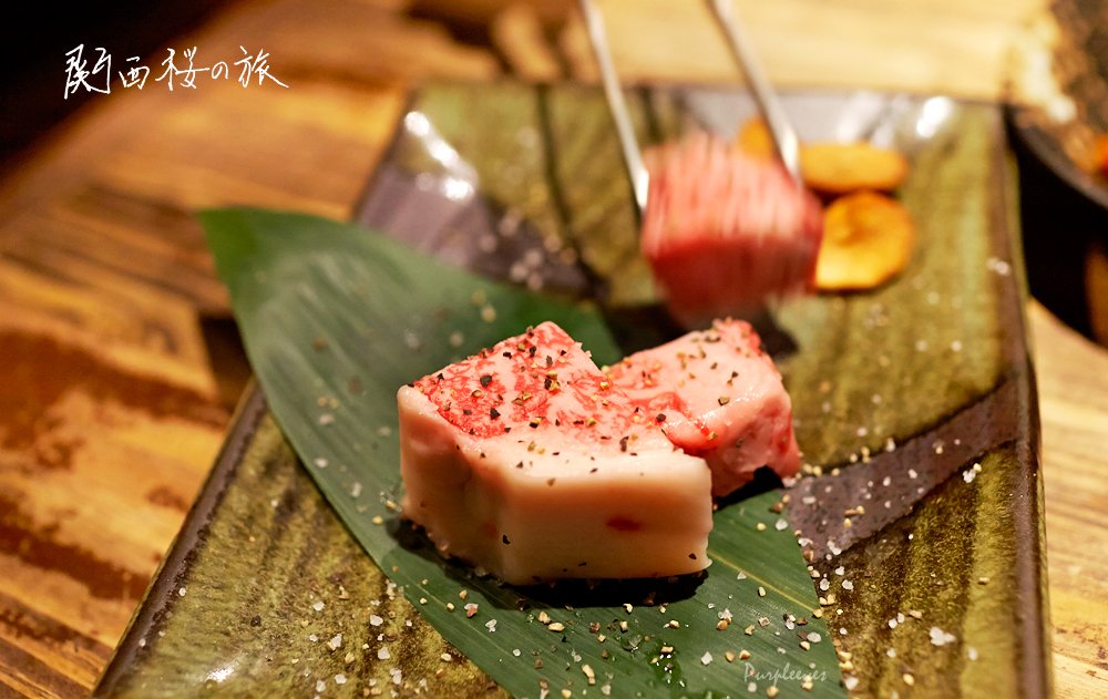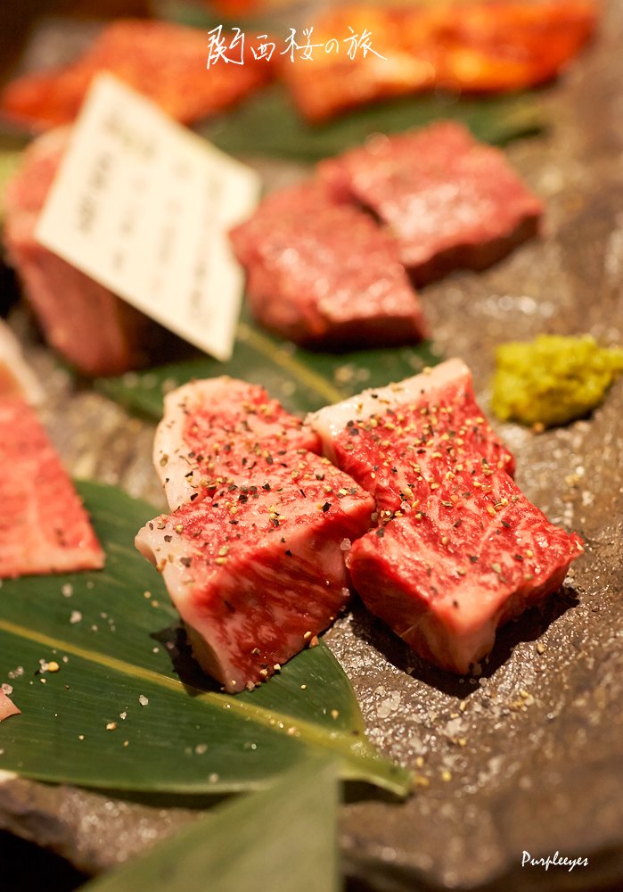 每一道牛肉,都需要有服务员小哥指导来烤熟,因为它们每一块基本都需要不同的时间才能烤到最佳状态,具体的时间我已经不太记得了。最先上来的这一盘,是油脂相对最多的部位,估计也是为了让它给烤肉网多刷些油。先来看看这最棒的雪花和牛吧!