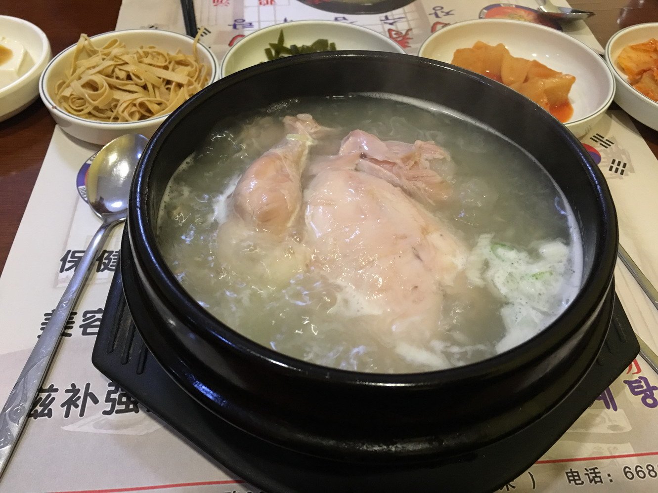 参鸡汤有3个品种,普通的、中药和养生的,价格分别是58/68/78元,我吃过前两种,第二种就是多加了一点沙参和山药,吃起来并不苦,其他口感并没有什么差别,所以普通款的性价比更高。随餐附赠泡菜萝卜、海带丝、豆腐丝等,配菜味道都很好,不够可以再加,有免费的茶水可以续杯。