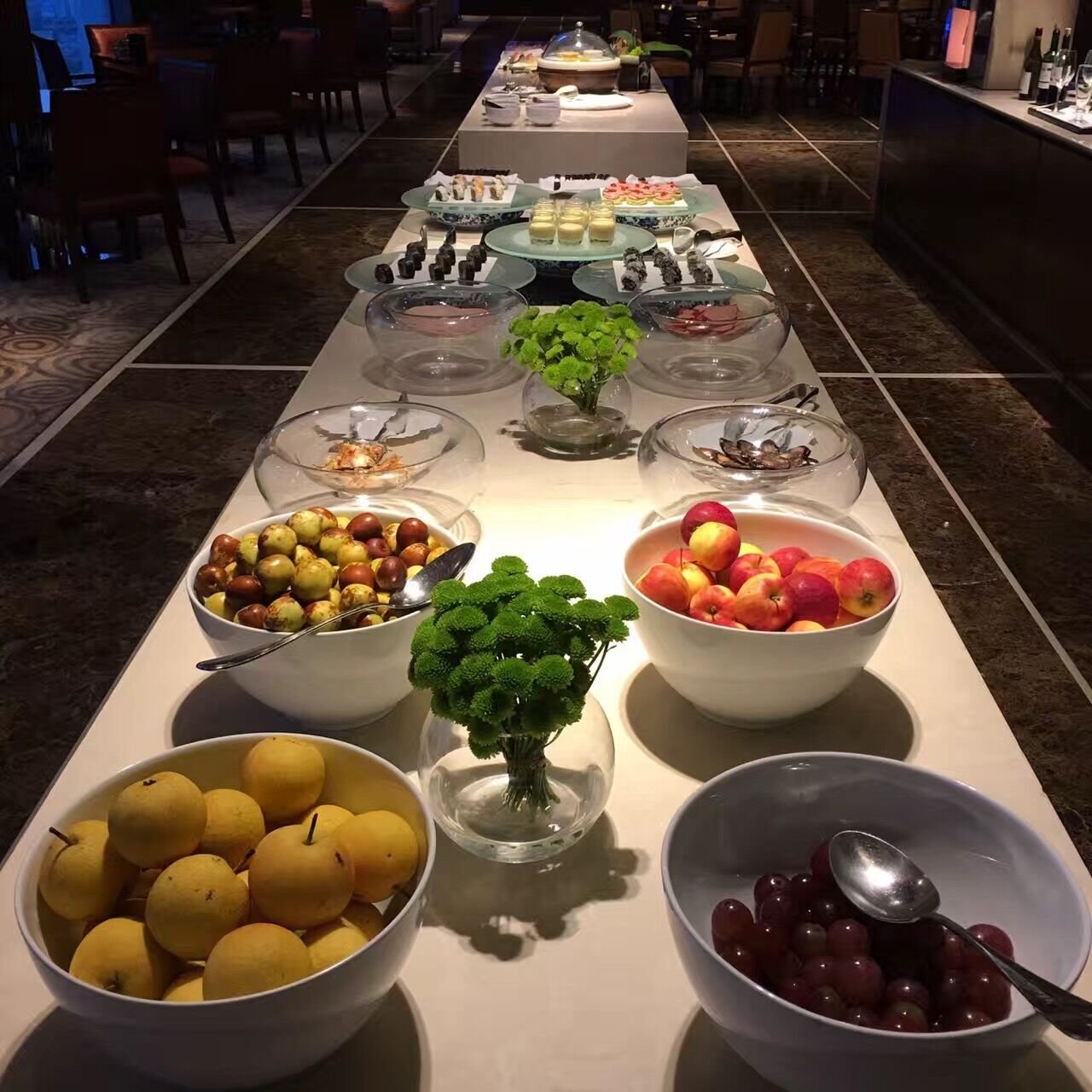 上海外滩茂悦大酒店嘉宾轩,入住酒店的嘉宾轩楼层,其实就是行政楼层哦,或者是凯悦集团的钻石卡客人可以来这里的,有水果、饮料、果汁、饼干以及小吃,晚上的欢乐时光还提供一些热菜,如果要求不太高的话,这里完全可以当晚餐吃的。