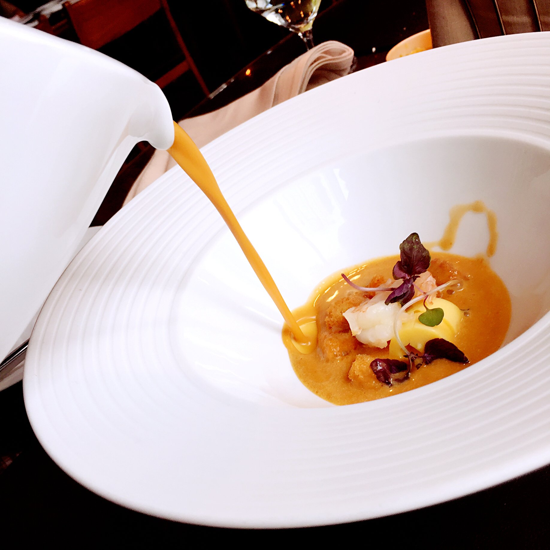 没有选择前菜,选择的是【龙虾汤】。这个龙虾汤看上去十分精致优美,可惜味道善乏可乘,实在一般,竟然有种难吃的感觉。可能是因为使用的是真龙虾,所以口感真的很难吃。之前在苏州洲际的酒店也尝过一次龙虾汤,味道一样,也是焦焦的苦味,实在非常难吃。于是死性不改,想到这里再来品尝一次。没想到味道比苏州洲际的还要难喝,汤很浓稠,但是汤是苦的,而且是带有一种焦苦的味道,这是让人难以下咽。可能是中西方餐饮的差别,问过服务员,服务员也不能够接受这个汤品的味道。98元的龙虾汤等于浪费,只能远观,而不可亵玩焉。