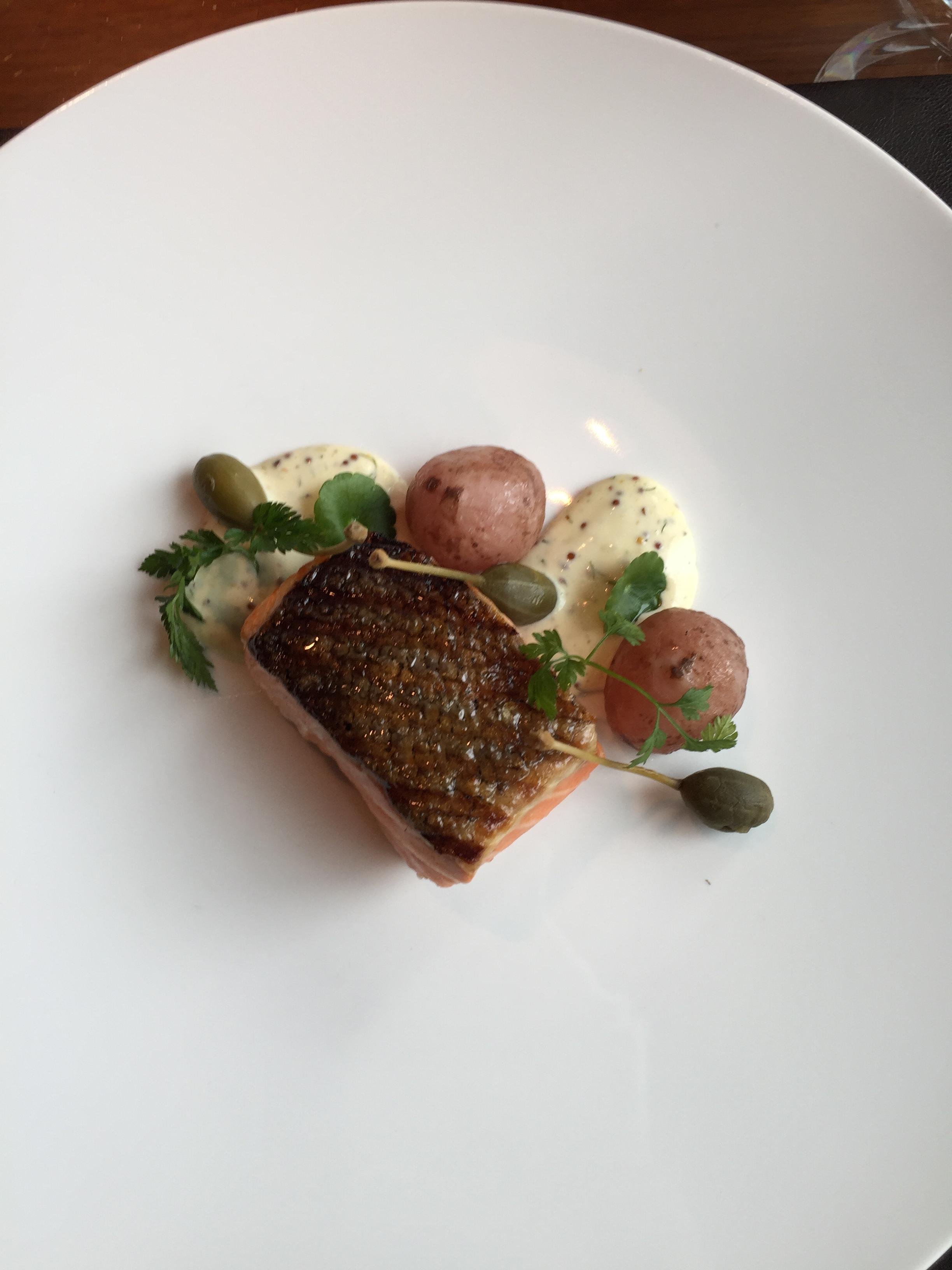 【主菜慢炖三文鱼】这道菜是要大加赞赏的,三文鱼的部位选择十分到位,而且味道也相当可口。由于炖烤的时间十分到位,所以三文鱼入口即化,而且十分juicy,三文鱼皮烤得脆脆的,也相当可口好吃。