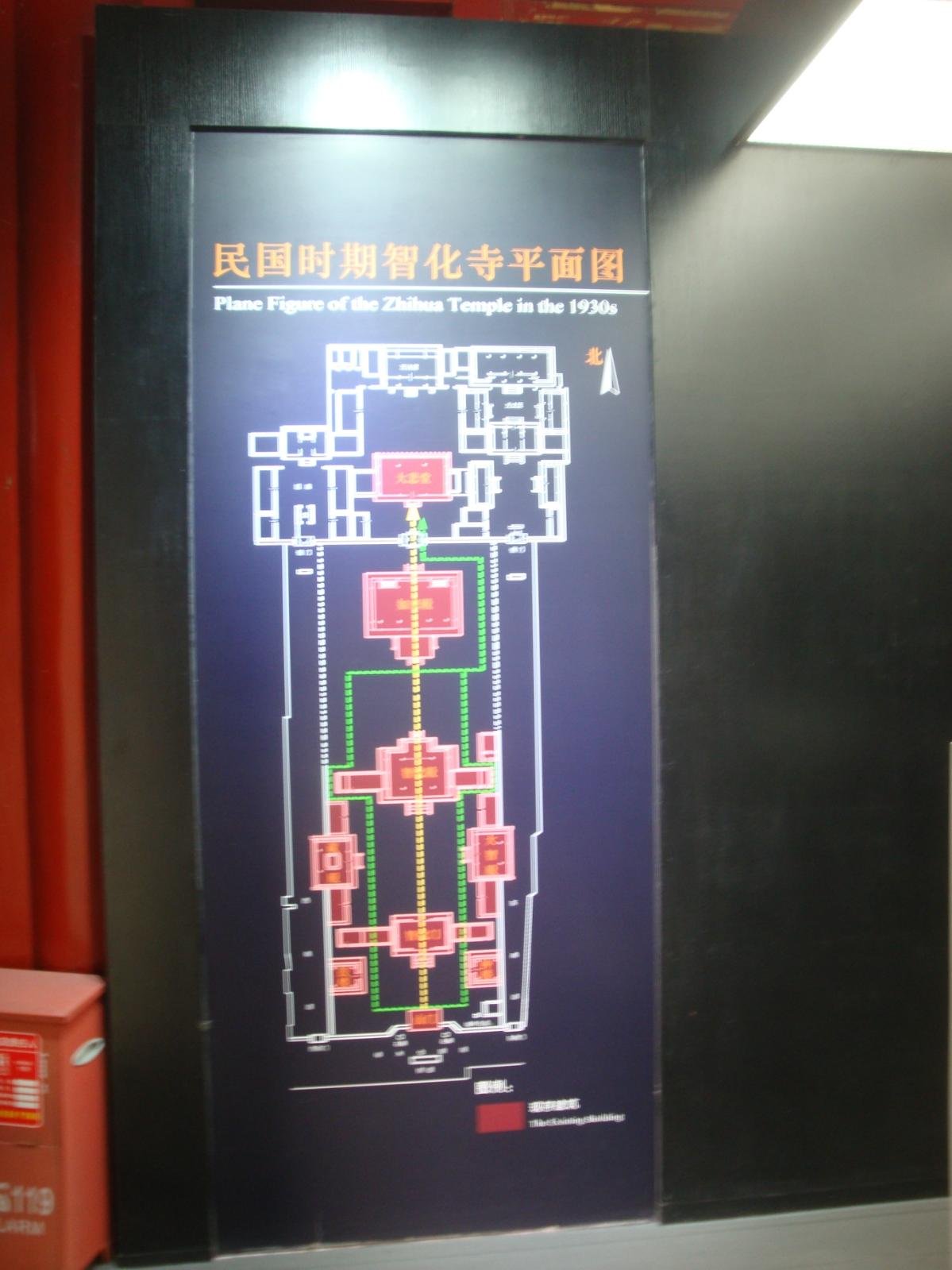 从智化门洞里看智化殿别有韵味。它的主要建筑自山门内依次为钟鼓楼、智化门、智化殿及东西配殿(大智殿、藏殿)、如来殿、大悲堂等。寺内主要建筑物的屋瓦用黑色琉漓脊兽铺砌,虽经历代多次修葺,梁架、斗拱、彩画等仍保持明代早期特徵。经橱、佛像及转轮藏上的雕刻,道劲古朴,艺术高超——引自百度。