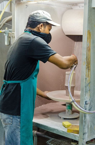 一直往里面走便是他们陶瓷的制造工厂了,里面几十名工人分工明确,有的制作粗胚,有的负责雕刻,有的负责打磨,有的负责加釉,有条不紊的进行着,即使游客从身旁走过,也是安安静静的坐着自己的本职工作,好似再说,这一群没见过世面的二愣子,我这不是在侮辱二愣子