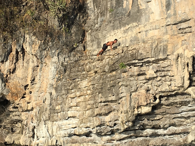 Buya Bay附近的深海岩壁,进行岩壁跳的地方,就是徒手攀爬到岩壁上再跳水下来,全都是老外在干这种事,船上的小黑还给我们表演了一下,爬到离水面差不多二十米左右的地方,单手做俯卧撑,然后让大家起哄,他就脱裤子,最后再翻滚几圈跳下来,录得有小视频,不知道能不能让大家看到,真刺激