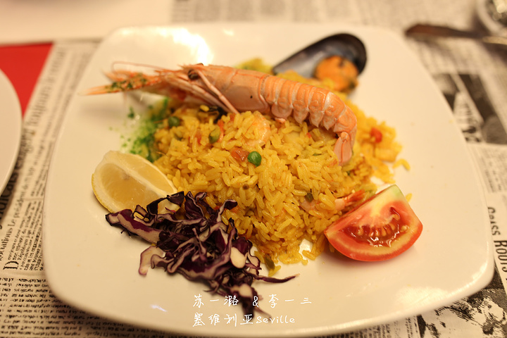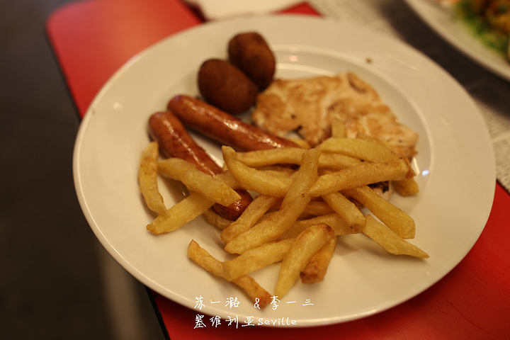 5、塞维利亚最古老著名的餐厅:Las Escobas 这家餐厅据说很有名,大文豪塞万提斯当年也经常光顾,算是历史悠久又有名人效应的餐厅。餐厅外有很多露天座位,我们去的时候,正好剩一个露天座位。而餐厅内则没有太多人,看来大家都喜欢在户外享受美好月光。餐厅有英文菜单,我看到Paelle,以为是传统海鲜饭,就点了一份。一般海鲜饭都要求点双人份,但这家可以点一人份,比较贴心。另外点了一份儿童套餐,有鸡肉、薯条、肉丸和香肠,还挺丰富的。