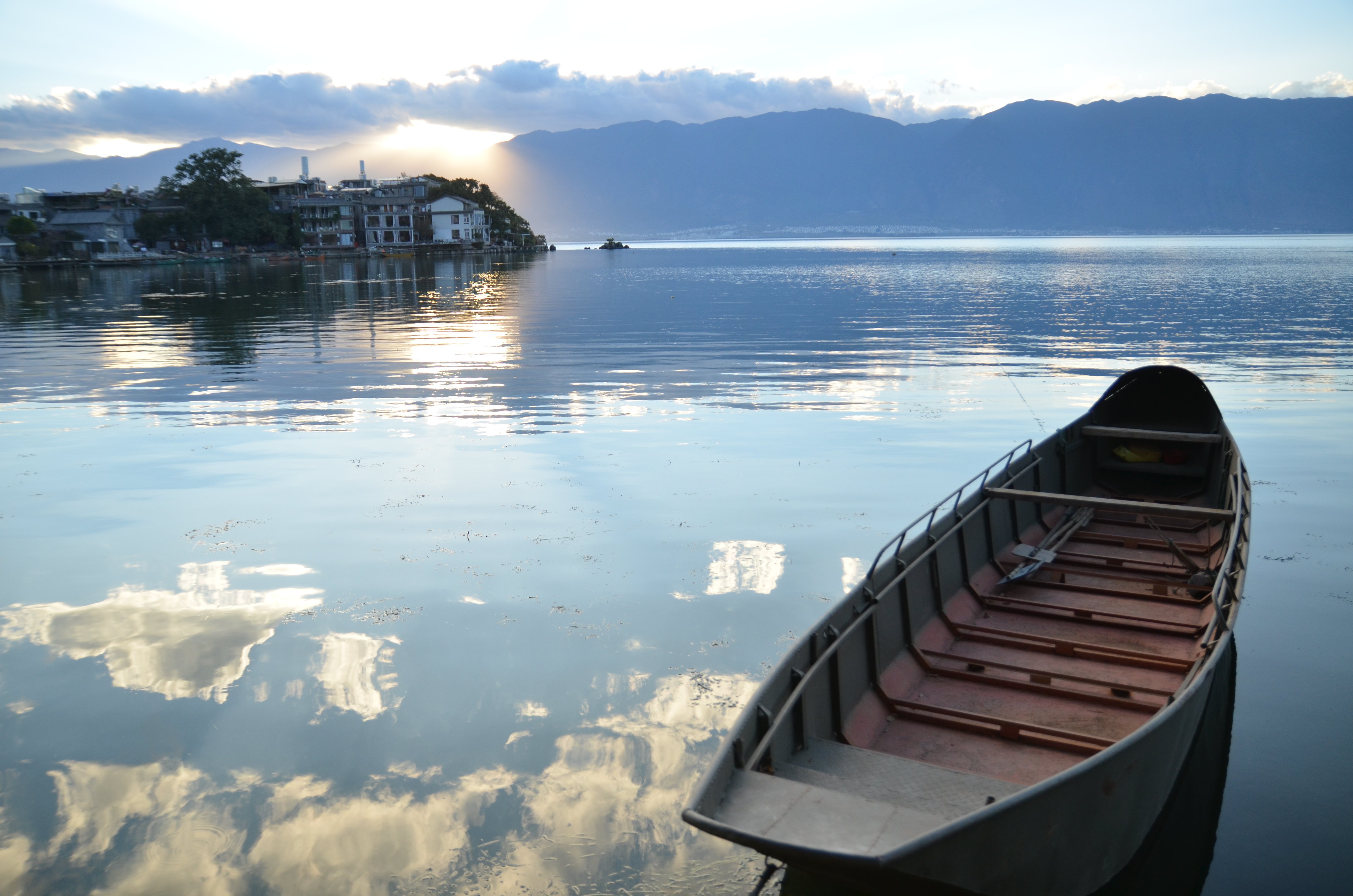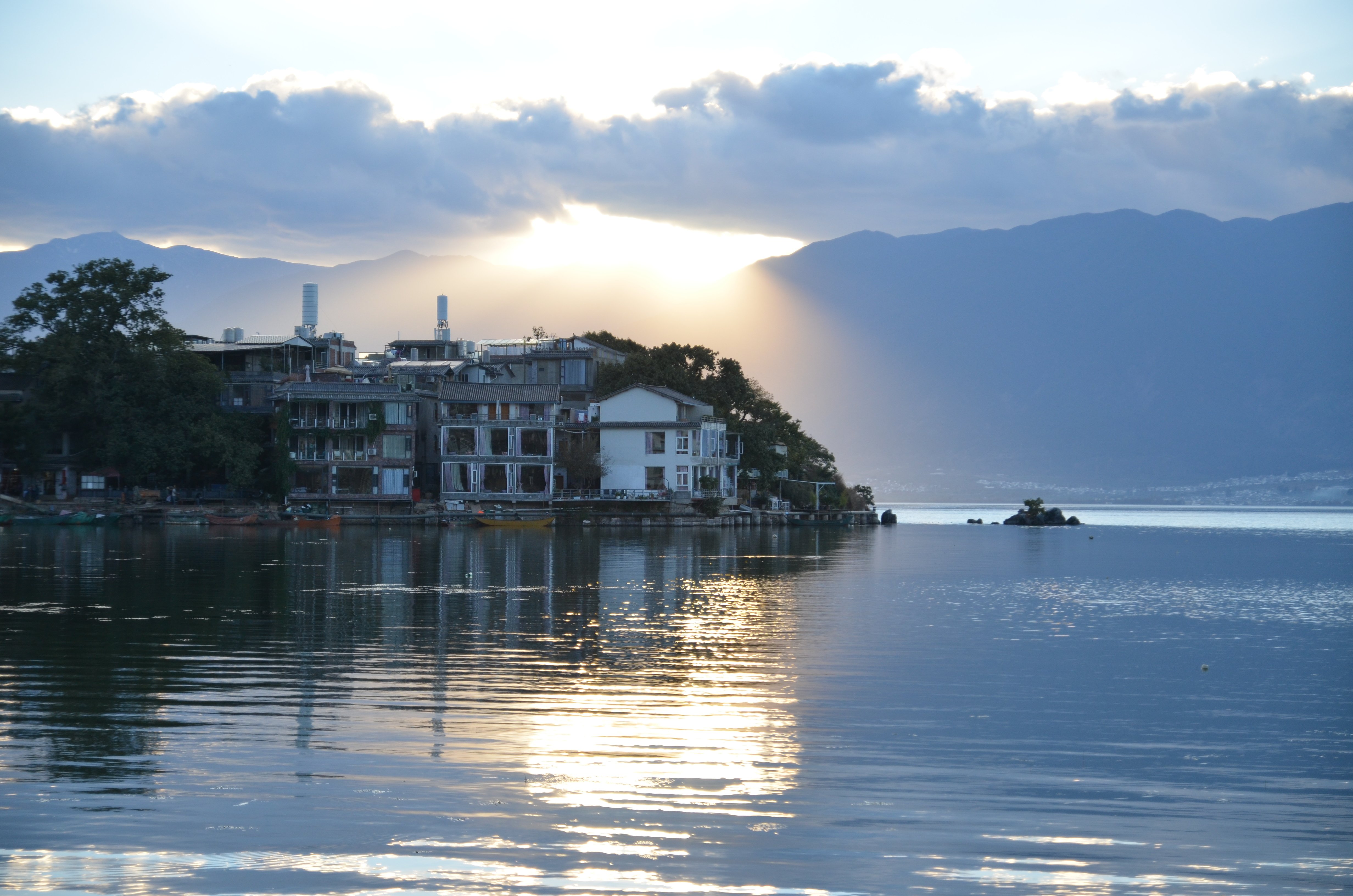 再往前走就可以到达双廊镇的主街上了,大建旁村的临海那边的景色真的很美,而且因为人相对更少,显得清净闲适。有阳光和没有阳光的洱海简直是相差了好几个档次,金光闪闪的海面让人留恋。