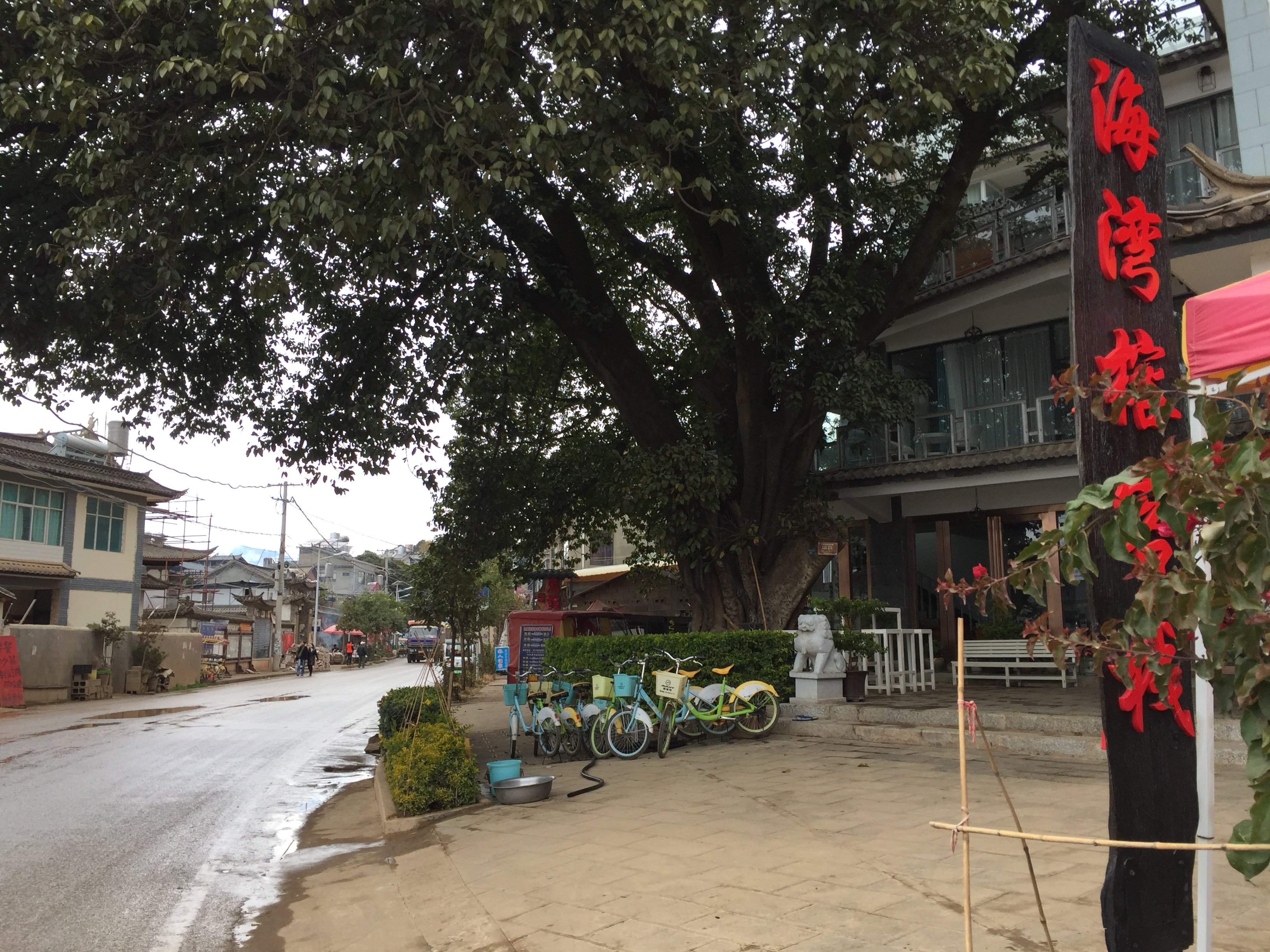 进入村里最繁华的路口有一颗很大的榕树,这里也有一家叫海湾榕的客栈,然后租自行车和电瓶车的店铺开始多了起来。