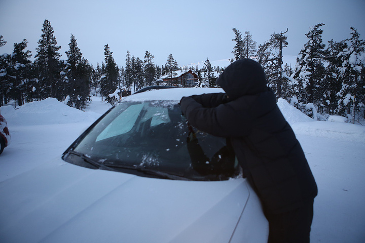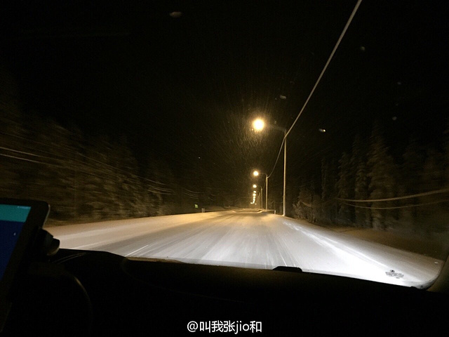 原本要去耍的冰上卡丁车,由于当天是大风雪天气,有些不适宜。况且滑雪完之后天已经开始黑了,还得驱车回罗瓦涅米,太晚夜路难开,于是就取消了这段行程。 今天的旅途很艰难,大雪,天黑的更早,沿途没有风景,只有这样……… 对向车道驶来卡车或者大巴的时候,扬起的雪会导致“致盲”3-5秒,确实有点危险!