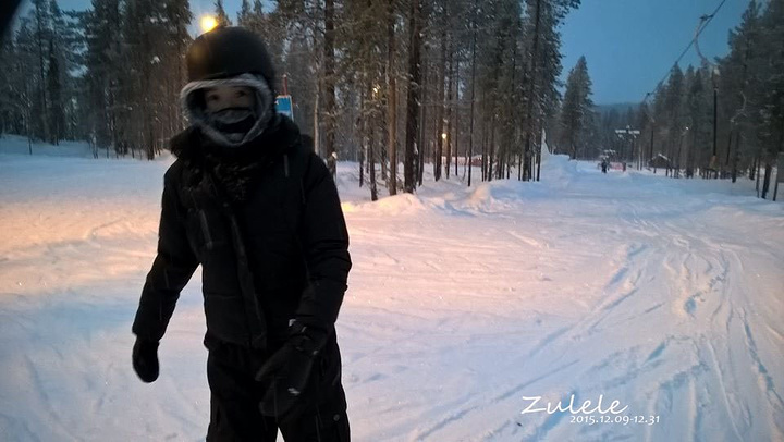 我觉得教练很棒,虽然芬兰口音很重的英语,我实在听不是太懂,但是超耐心,肢体语言还是很到位的哈哈哈!人超nice!今天在鹅毛大雪里面滑雪,超有feel啊!不过回来我们俩的“忍者面罩”已经全都是雪了…………看我兜了一帽子的雪[抠鼻屎]