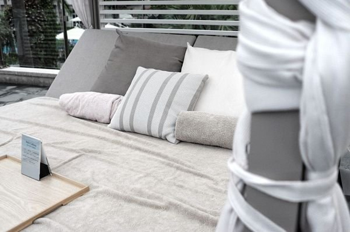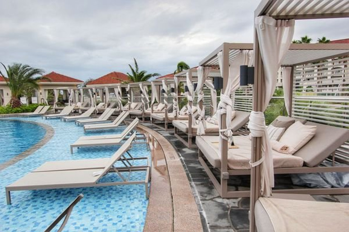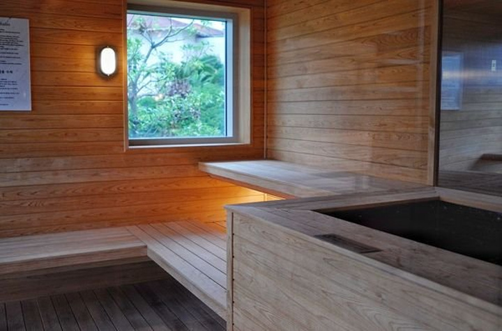 往上去是成人泳池,大大的沙滩床可以付费使用,旁边的沙滩凳就任君选择了,最惊喜的是在成人泳池旁边有一间小屋子,里面是桑拿房间,游泳后可以桑拿桑拿出一身汗排排毒。
