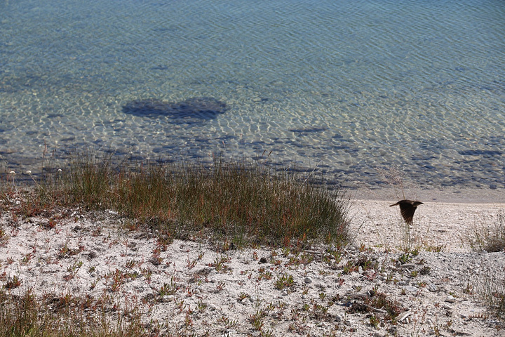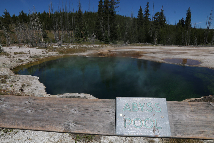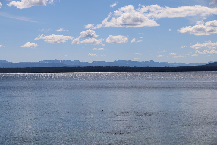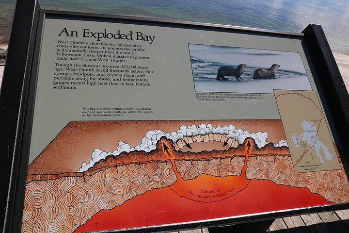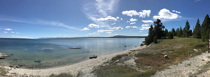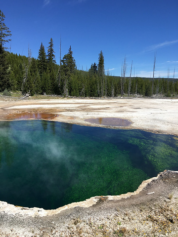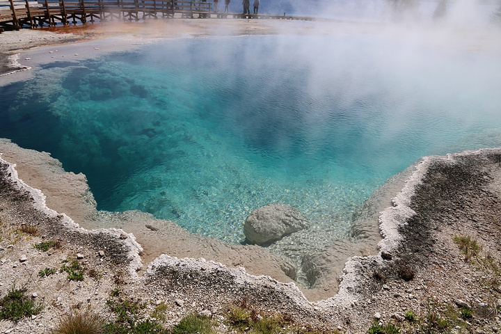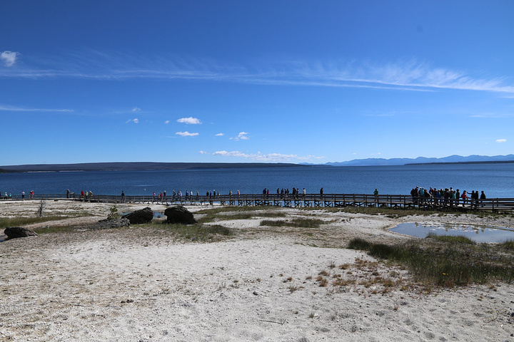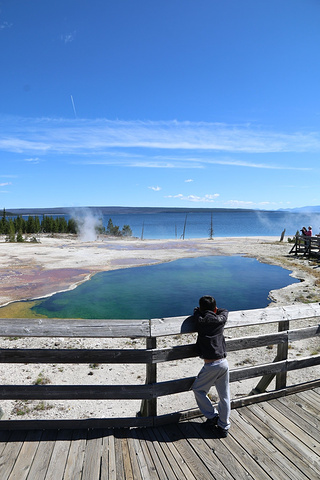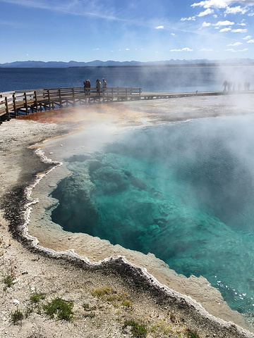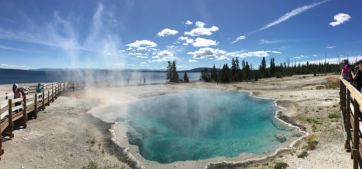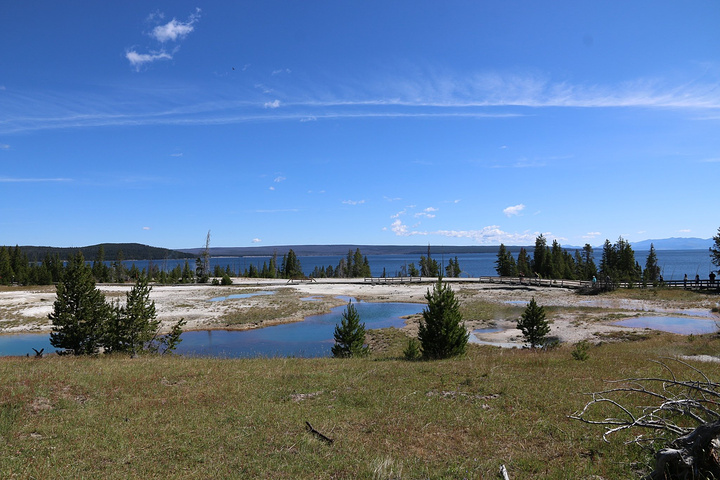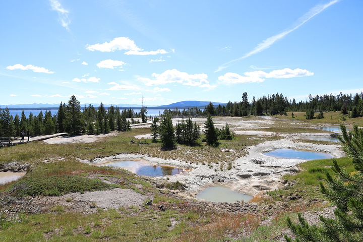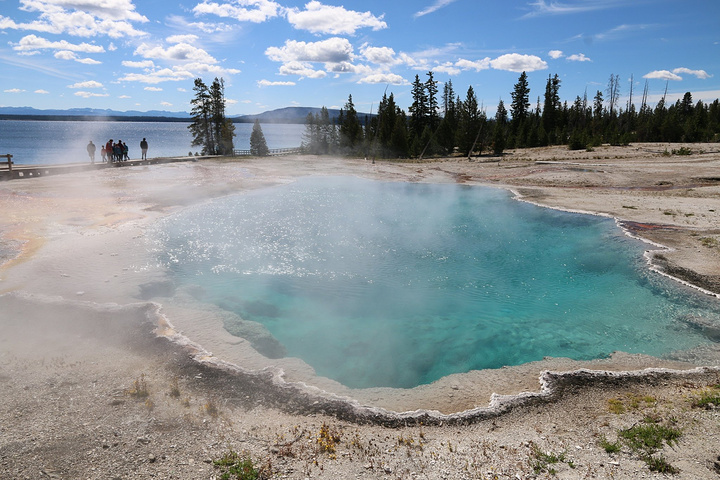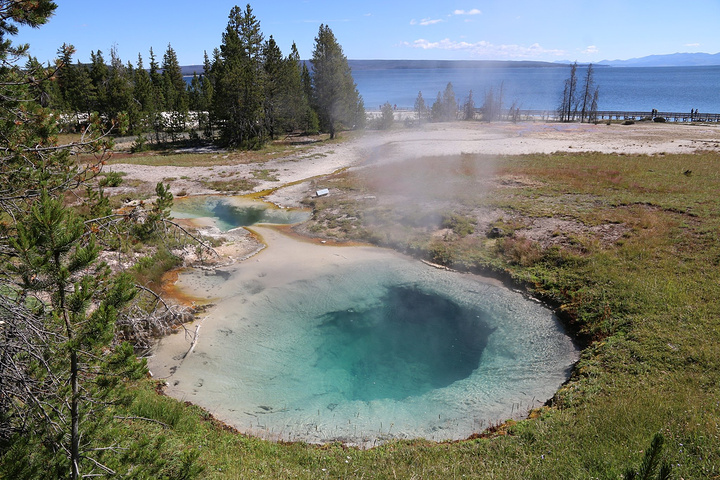 同样是一片盆地中散落着一个个泉眼。但和诺里斯间歇泉盆地不同的是,这里的泉水更蓝,加之依傍开阔的黄石湖,水清得更显纯粹。好几处泉眼就在接近湖边的地方,冬天较高的水温让附近的水面不会结冰。不管是猎人还是水獭都喜欢在这里捕鱼。有的猎人干脆直接把捕到的鱼丢到温泉里煮熟,就地美餐一顿。
