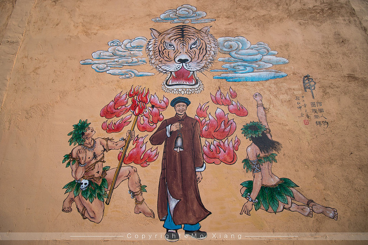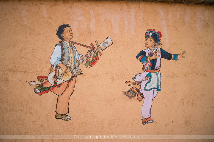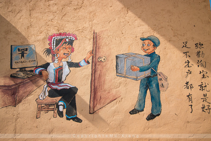 壁画也可以说是可邑小镇里的一大亮点。行走在村子里你会发现这里很多住户家外的墙壁上画着生动的壁画。这些壁画有彝族人传统的音乐舞蹈及事物,也有今年来农村淘宝带来的致富路。