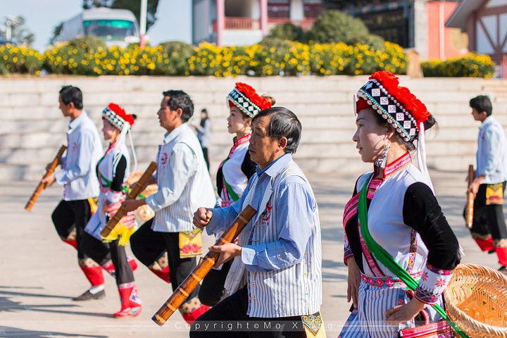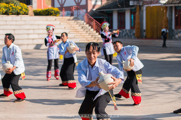 由于阿细跳月舞蹈强度比较大大,特别是彝族男人在跳舞的时候还要肩挎四五公斤重的大三弦,边弹,边唱,边跳,基本一个舞蹈下来早都累的满头大汗了。