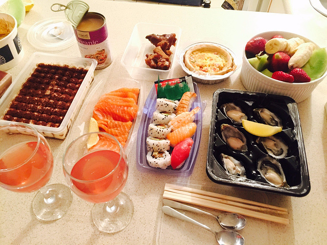 左手边的提拉米苏超级大!鲍鱼和三文鱼很新鲜~ 总之自己做比在外面吃一顿便宜很多~我吃了三天