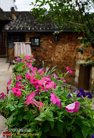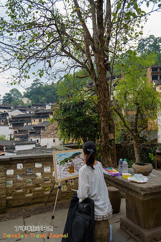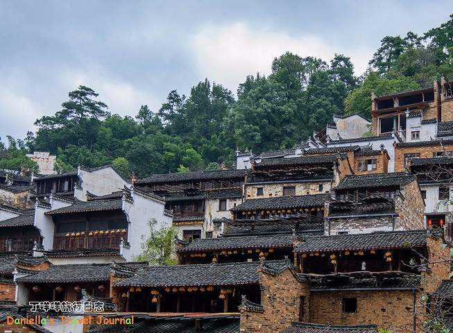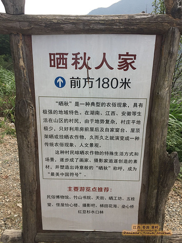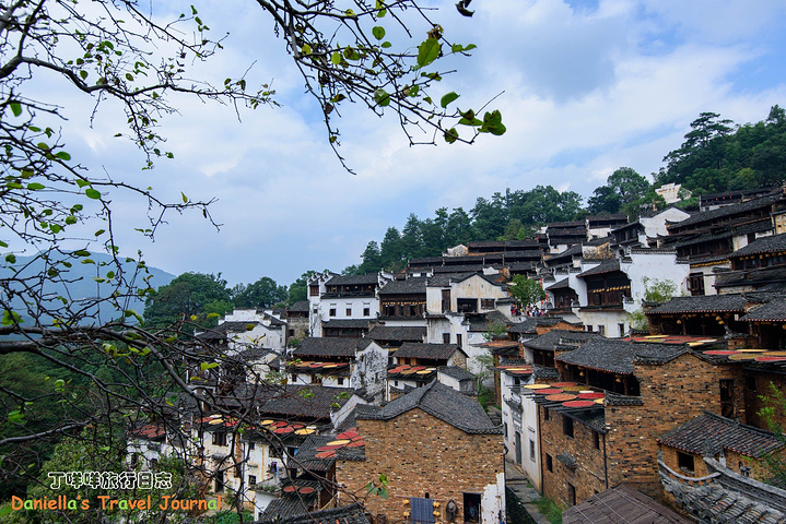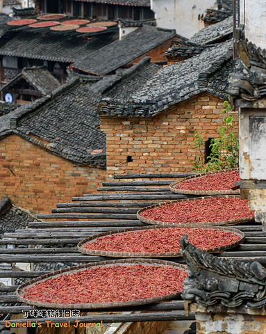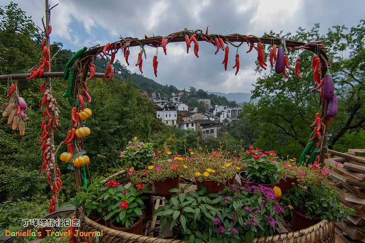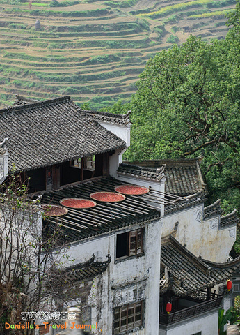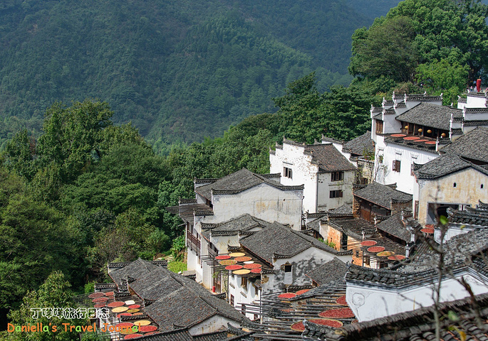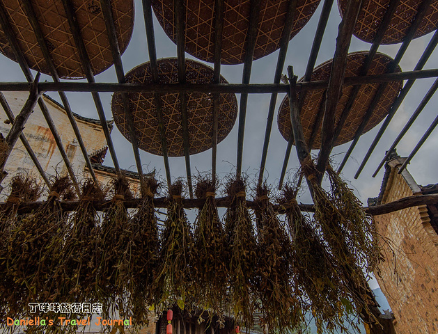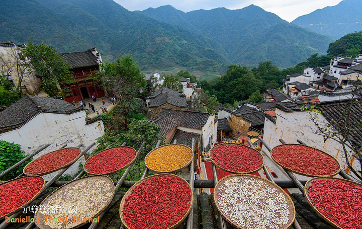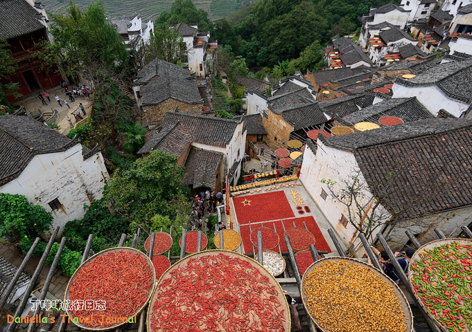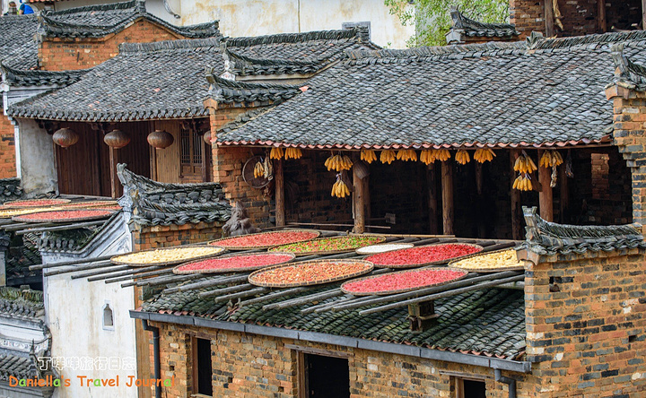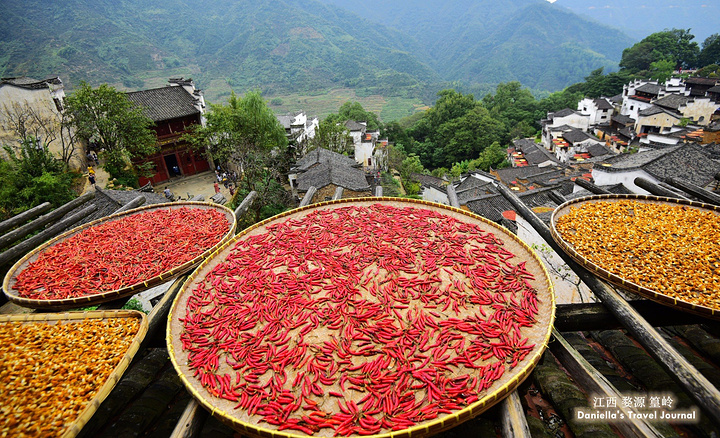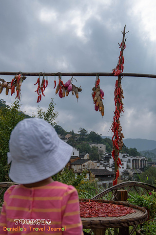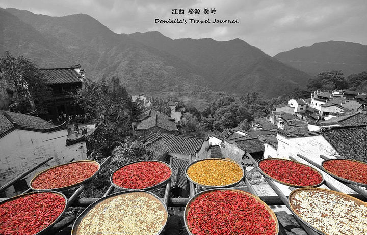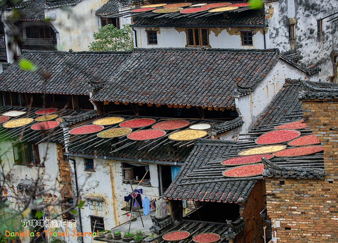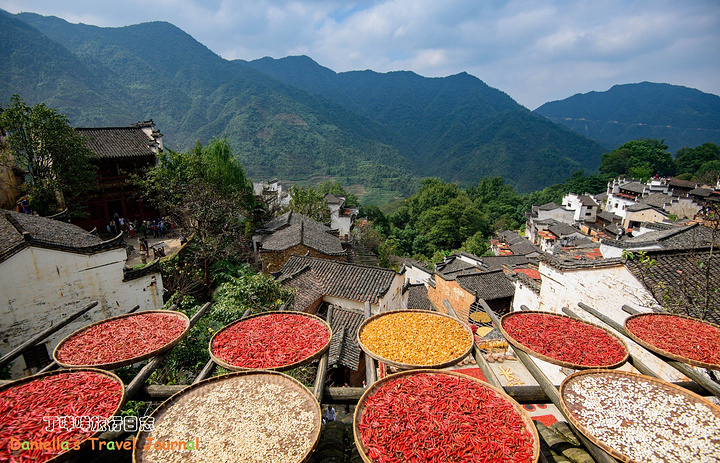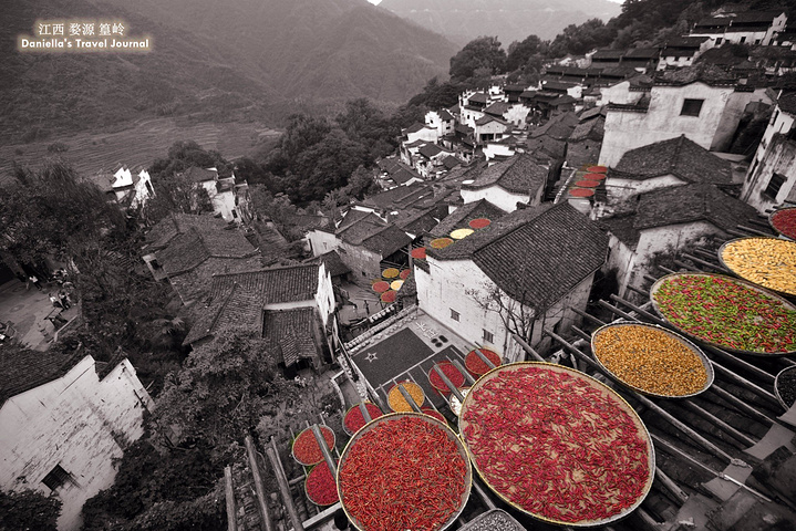 坐着缆车登上了位于半山腰的古村落 – 簧岭,向下俯瞰,这以黑白为底色的古村落,在山水间就像一幅清新淡雅的水墨山水画卷。青山绵绵,绿水延延,树影婆娑的村口,矗立着伟岸的牌坊默默的守候着世代居住在这里的纯朴的人们。伸手摸一摸这泛着青褐,挂满沧桑水痕的白墙,问一问,它们是如何的饱经沧桑却依然平静自得?这,就是向你默默讲述故事的历史本身。我相信每间老房子都是有生命的,有着它们独特的经历和各自的神秘。这些老建筑从外观上看从不给人华丽高贵之感,但是走进去则各显神通:精美的砖雕,木雕装饰房屋的框架和边缘,隔扇;色彩艳丽的画作装点着廊栋。大多数的人家还是崇尚木色本色的,朴实且简约大气。就是这些特点,不动声色的坚持着徽派建筑独有个审美观点,殷实与精巧的结合,上千年来一直沿袭。直到我们看到近些年建造的白房子,仍然少不了这些元素。 篁岭,仍然是个不在传统婺源通票里的景点。我们选择这里,一是,因为正值秋季,村子里家家户户都在“晒秋”,把粮食放在屋顶摊在大大的圆形草编簸箕上,晒辣椒,玉米,等很多颜色的粮食。红绿黄的粮食晒在青瓦白墙的屋顶上,让类似黑白水墨画的婺源村落变得更美更有生机。 二是,因为篁岭地处半山腰,上来要做索道上山,特殊的地理位置,让篁岭的景色看上去优雅妩媚中,多了磅礴大气之美。远山,梯田,凌空架起的吊桥,这里呆上两天都玩不够。