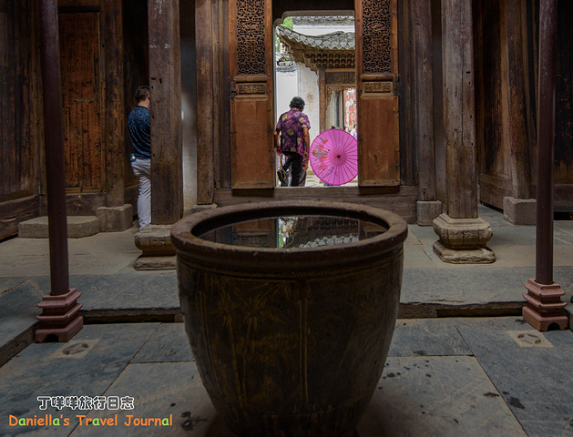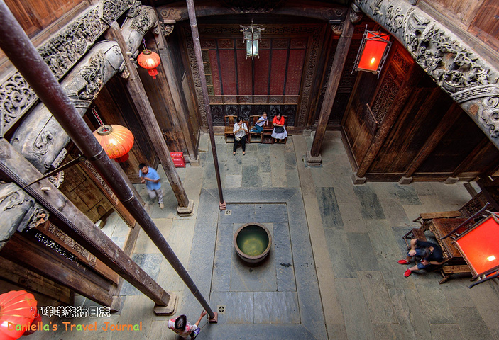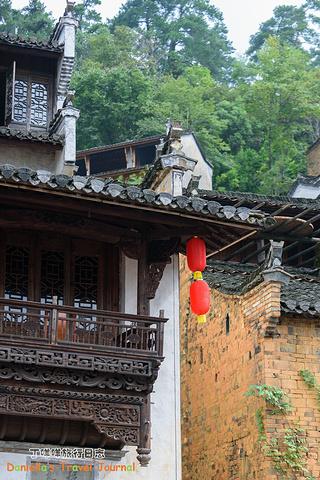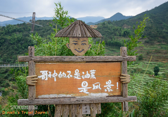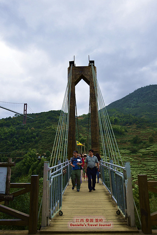 远处的吊桥连接着篁岭村和山谷对面的山头,吊桥有高低两层,低层设了山谷滑索,走过吊桥经常能听到滑索游客激动的尖叫声。图中的湖叫“心湖”是个心的形状,所以很多人都心湖旁挂同心锁,以祈求相亲相爱,长长久久。
