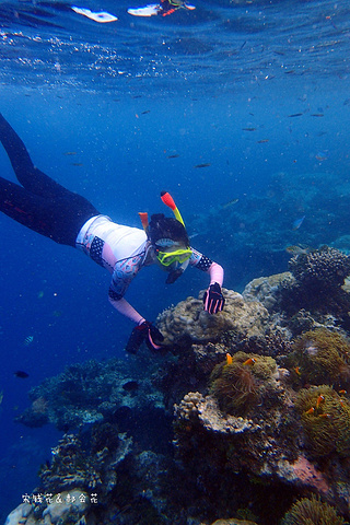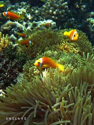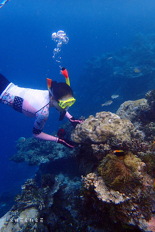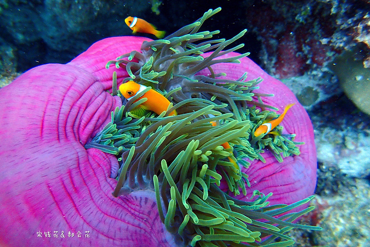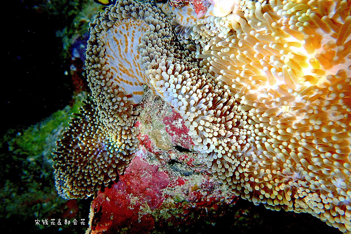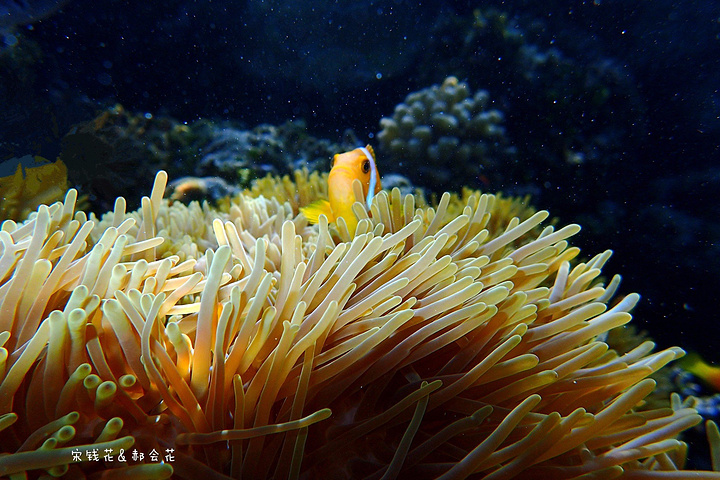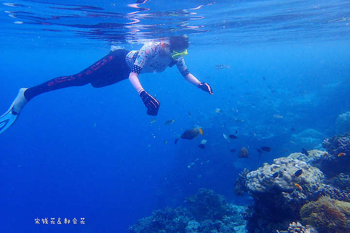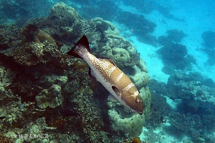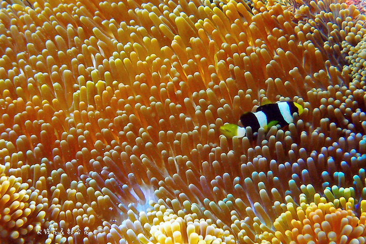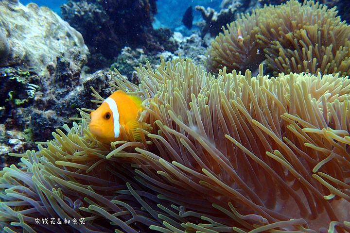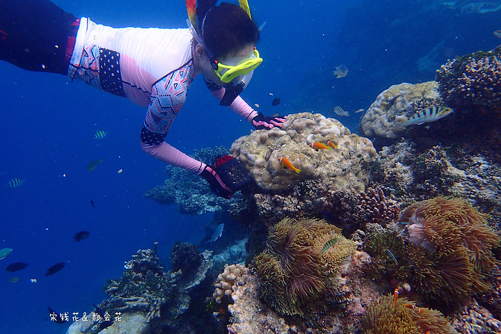 吃完饭刚回房间,钱花就迫不及待的下海浮潜去了。我可要消化一下中午塞满的食物,沿着门前的沙滩拍了一些照片,结果晒得全身发烫,只得躲回沙滩椅里,看着钱花在海里扎猛子。等消化得差不多了我也加入了浮潜的队伍,跟钱花一起沿着海沟一路向东游。这一带有很多活珊瑚,也有很多小丑鱼,只是我们俩自由潜都不怎么样,不到两米的深度下去的都挺费劲,想拍张小丑鱼的照片简直用尽了洪荒之力。