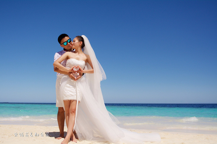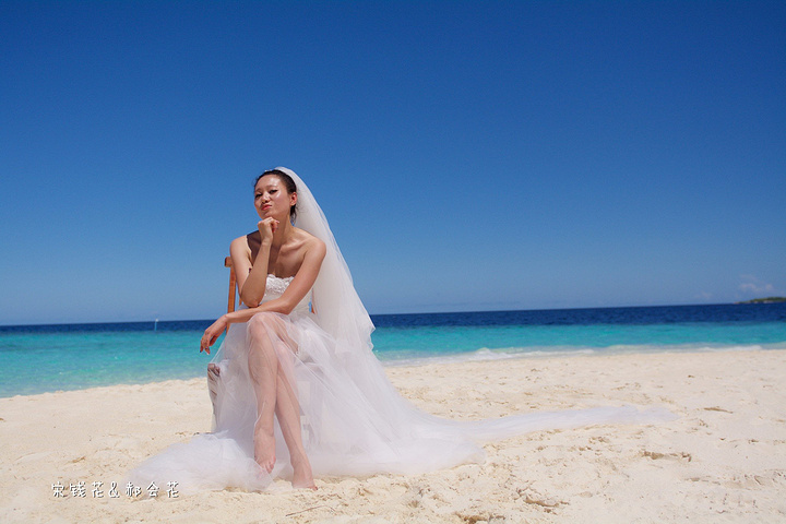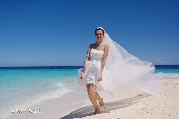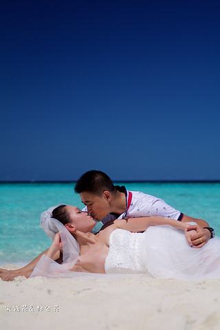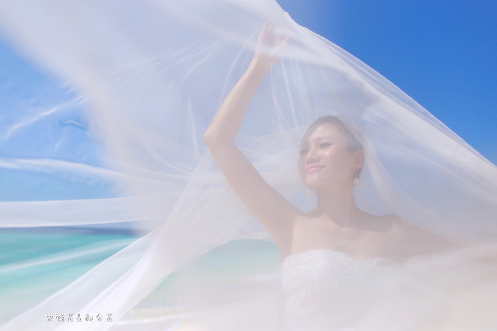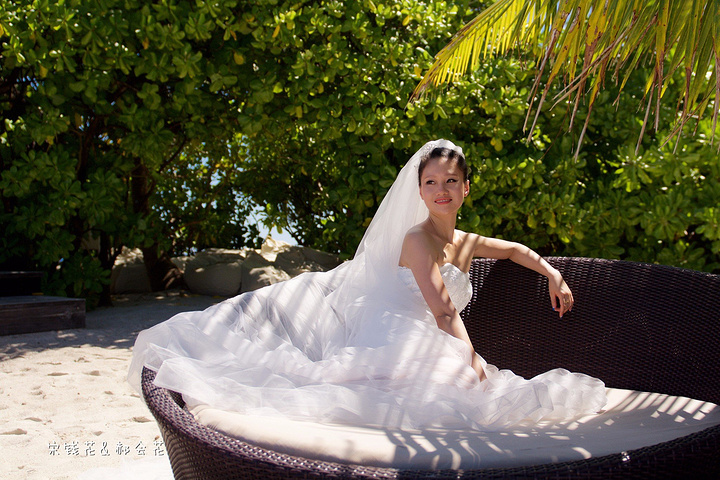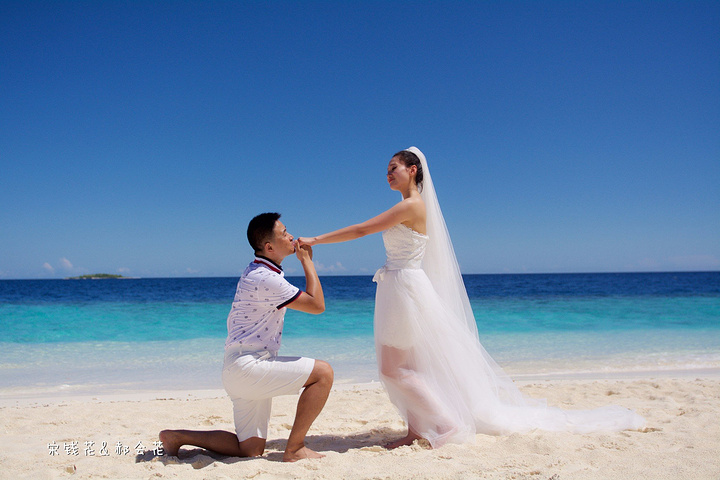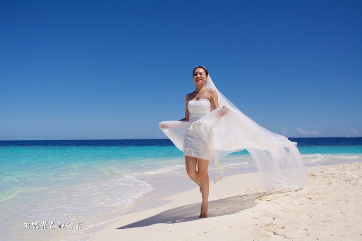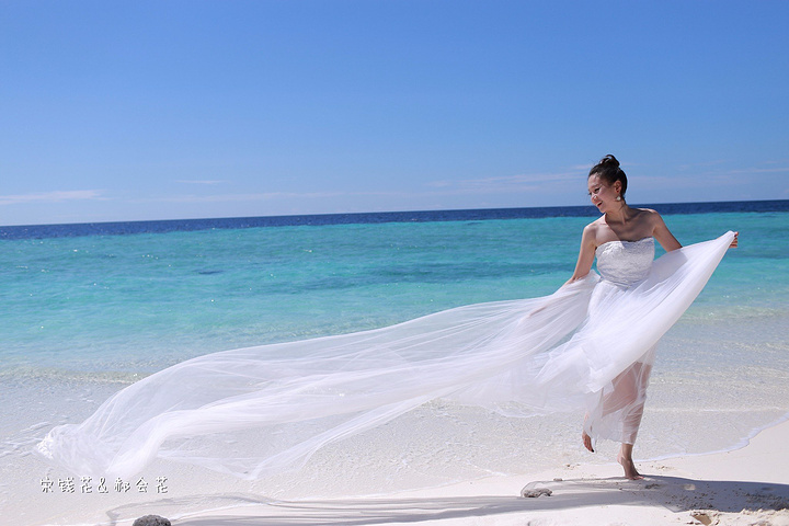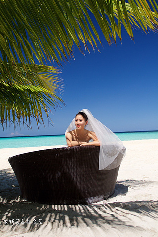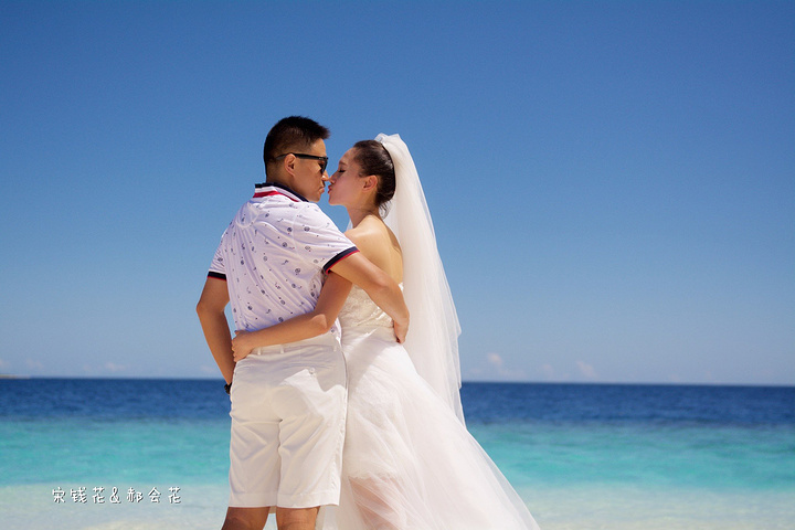 凌晨四点多,哗啦哗啦的声音吵醒了我,走到露台一看,瓢泼大雨啊,瓢泼都不能完全形容了,简直是盆泼!心里不免为预约的跟拍着急。早上6点钟醒了(时差关系,睡不了懒觉)出去一看,万里无云有没有,岛上的天气真是变幻莫测! 早餐后我们先在门前的沙滩上拍了一些照片,发现风好大,婚纱照真的有点HOLD不住。