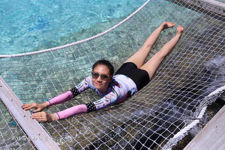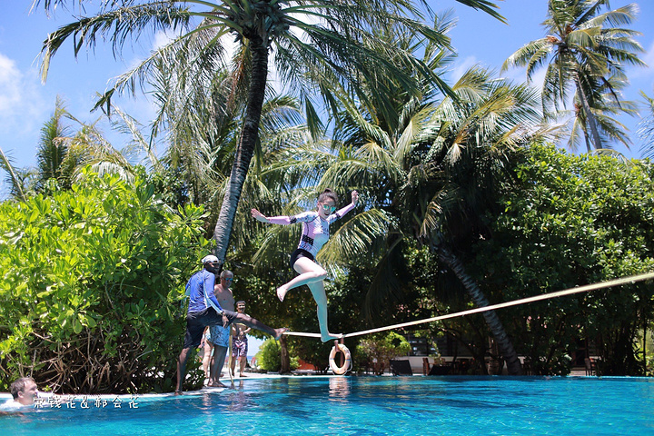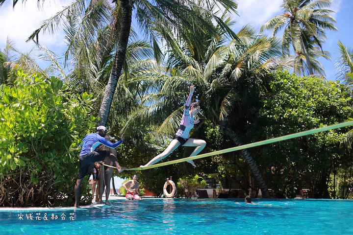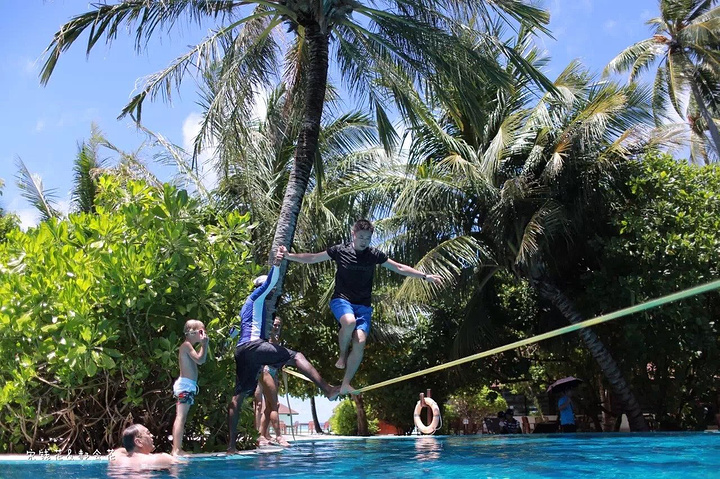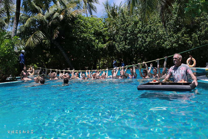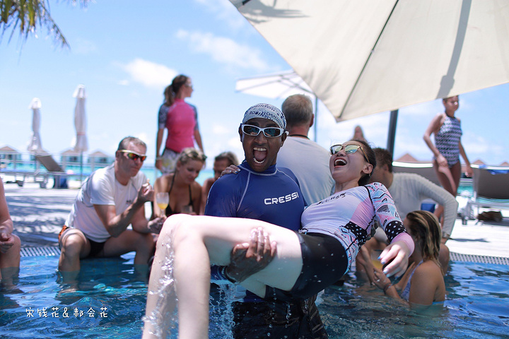 泳池派对很热闹,建议大家尽量能赶上周三的派对,有香槟、果汁和鲜虾沙拉小吃供客人享用。现场DJ带领大家在水中跳操,另一端深水区上方横跨一条软绳,供大家体验、享乐。我们俩吃饱了喝足了之后也都去尝试了走软绳,好难啊!不到三步必定跌下去。尝试的外国人较多,中国人貌似就我们两个,国人都太内向了,玩不开。