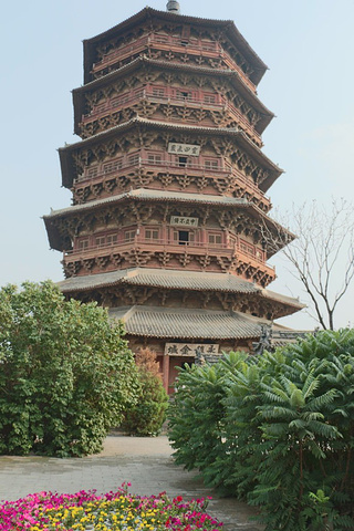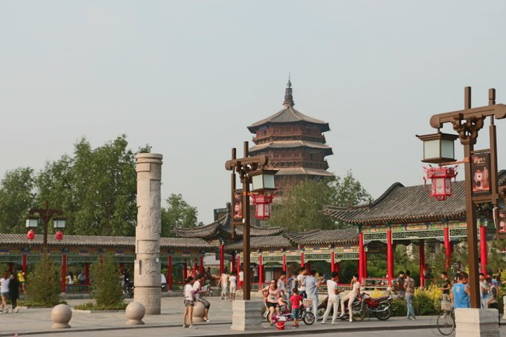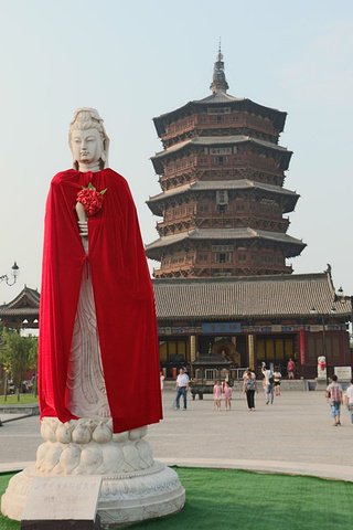 初见木塔,是离开悬空寺的一个小时之后.和乔师傅握别,背起背包,远远的,就能看见它。如今它的周围是一条仿古商业街,这是出于保护?还是全国范围内不能免俗的所谓开发其实是营利目的?沿路走去,眼里几乎没有他物。 来到佛宫寺前,看看时间是下午五时许。谢天谢地,还来得及游览,再晚个把小时,今天恐怕就要在应县打尖儿喽。。。