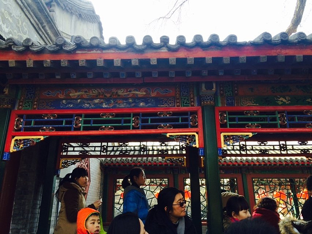 旅行接近尾声了,离转机还有一些时间,不想白白浪费掉。那就去北京最有福气的地方-恭王府转转运吧,讨个好彩头。107路公交车东直内小街上车,1个小时左右就到了恭王府,期间公交路过什刹海、眼袋斜街、鼓楼等地,车上顺道重温了一下。 半年前来过一次恭王府,当时没有租电子讲解器,觉得十分的遗憾。这次上前一租,竟然没有了,好在好多的旅行团,只能跟着蹭讲解了。 【背景知识】:恭王府始建于清朝乾隆年间,初为大学士和珅的私邸。同治初年,这里的第三代主人恭亲王奕訢,身兼议政王、军机领班大臣等要职,重权在握,显赫一时,乃大筑邸园,同时也对府邸部分进行了修缮与改建。我们看到的恭王府的建筑规模与格局,就是在那个时候最后形成的。 恭王府前半部是富丽堂皇的府邸,后半部为幽深秀丽的古典园林,总占地面积将近六万平方米。其府邸建筑庄重肃穆,尚朴去华,明廊通脊,气宇轩昂,仅次于帝王居住的宫室。府后的萃锦园则衔水环山,古树参天,曲廊亭榭,富丽天然;其间景致之变化无常,开合有致,实为中国园林建筑的典范。 根据现有的文献记载,在这块位于京城前海西岸,被"蟠龙水"环抱着的风水宝地上,元、明两朝曾经有过一座规模宏大的寺院,香火旺盛,游人如织,就连皇帝也来此礼佛上香。大约十六世纪中叶,该寺院才逐渐荒废,沦落为明朝廷的供应厂;清朝入主北京以后,在这里建造大小不等的院落若干,供内务府等普通旗人居住。 乾隆四十年前后,在皇帝面前红得发紫的和珅,相中了这块四周萦水,遥接西山,而且又离“皇上家”不远的风水宝地,遂以高价购买下这里的多处房产,建造成大名鼎鼎的“和第”。 著名的“福”字碑,就在山下。右手,从上到下摸福,福气沾染全身,讨个好彩头。