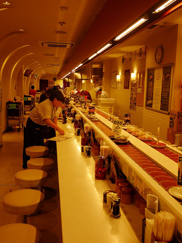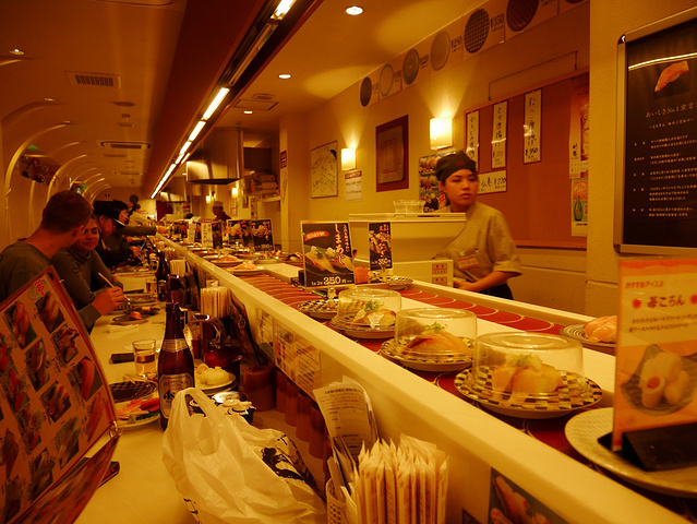 转来转去不知道吃什么才好,好吧,最后选了这家回转寿司,嘿嘿,日本的寿司做的还是水平很高的,看着每一种都很想吃,吃下来也觉得每一种都很不错。刺身都很大一片盖在米饭上,吃的很过瘾。特别推荐金枪鱼沙拉寿司,白白的不起眼,但是味道很赞,后来我们还想再拿一份吃,等半天发现已经没有了……