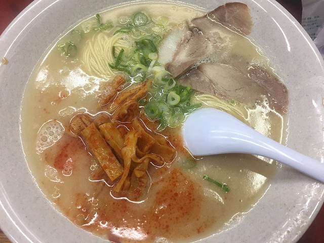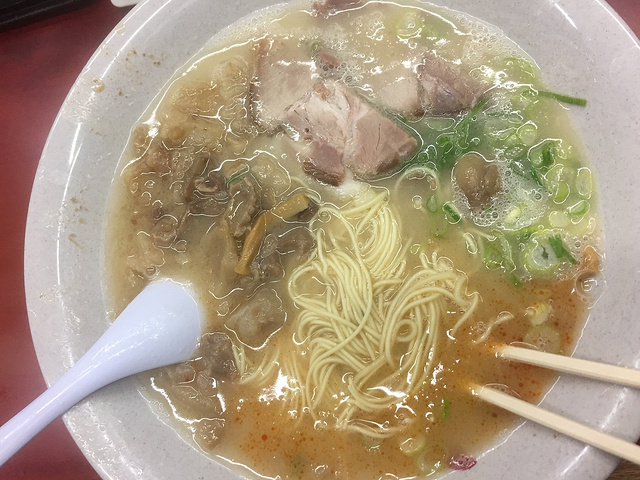 回到京都的时候已经天黑了,想着晚餐吃什么,还想吃昨天晚上吃的弘烤肉。但是今天没有预约,心想着去碰碰运气吧。老公一直在旁边说想吃面面有什么好吃的嘛我就没有理他……然后我们坐公交去了三条河源町那边,到了弘烤肉店,却被告知今天晚上客满,等到几点都没有位子了。好吧,好伤心,只好一路往回走,去吃了老公心心念念的博多拉面。结果却出乎意料的好吃!特别好吃!是我在日本吃过的最好吃的拉面!比攻略里面推荐过的都好吃多了!特别推荐!在河源町三条的先斗町那边。我吃的是辣竹笋拉面,特别推荐!比我老公吃的什么蹄筋面还好吃!蹄筋面有点点腥!