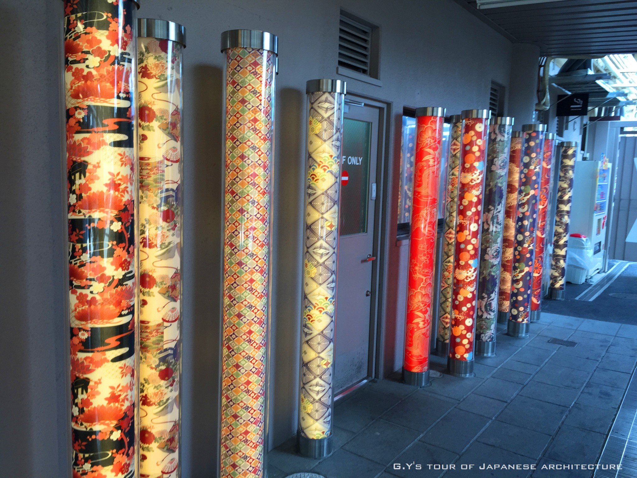 车站用光柱罩不同花式制作的布艺灯罩装饰。